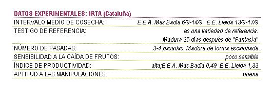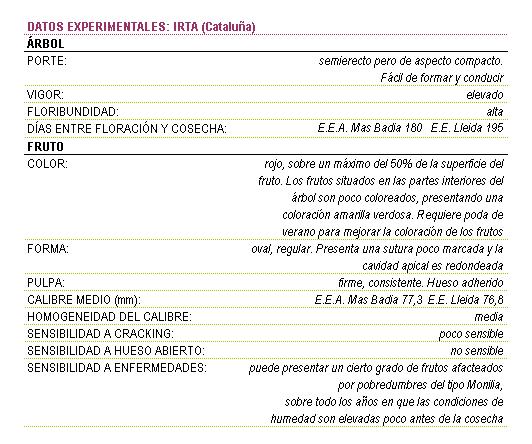 • Variedad de referencia que cierra la temporada de nectarinas de carne amarilla. Productiva, de buen calibre y buena calidad gustativa. Su principal inconveniente es la poca coloración de los frutos.
