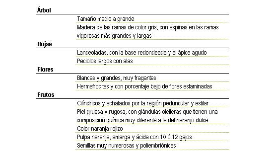 • Tabla con las características del grupo amargo. El árbol es de tamaño medio a grande, con espinas en las ramas. Las hojas son lanceoladas, con base redondeada, ápice agudo y peciolos con alas. Las flores son grandes y blancas. Los frutos son achatados  por la región peduncular y estilar. Piel gruesa y rugosa con glándulas oleíferas.Color naranja rojizo. La pulpa es amarga y ácida. Son frutos con numerosas semillas.