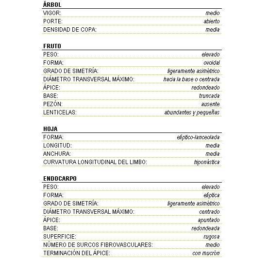 • Es una variedad vigorosa y de entrada en producción tardía, su productividad es elevada y alternante. Enraíza fácilmente por estaquillado. El contenido en aceite es bajo y la separación de la pulpa del hueso es difícil. Es apreciada como aceituna de mesa por el tamaño de sus frutos. Se considera susceptible a repilo y tuberculosis.
