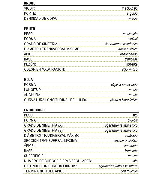 • Maduración temprana y escalonada, con una producción media pero constante. Frutos de buen tamaño y baja resistencia al desprendimiento. Poco resistente a la sequía. Sensible a la mosca y tuberculosis. Variedad de mesa empleada para aderezo en verde que posee un uso secundario como productora de aceite, siendo este de buena calidad, con un rendimiento graso medio.