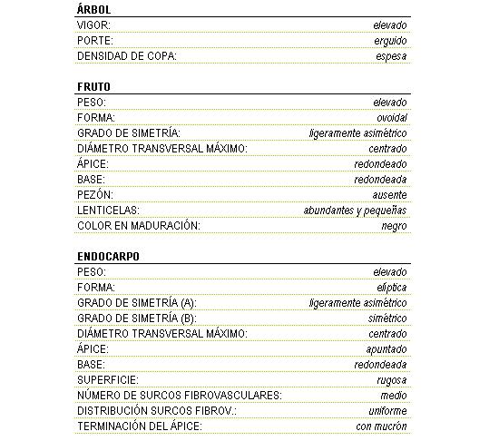 • De productividad media y vecera, parece tener problemas de cuajado de frutos. La maduración de sus frutos es temprana y presentan baja resistencia al desprendimiento. Se utiliza para aderezo por su elevada relación pulpa/hueso. El contenido graso es bajo. Se considera resistente a mosca y sensible a tuberculosis.