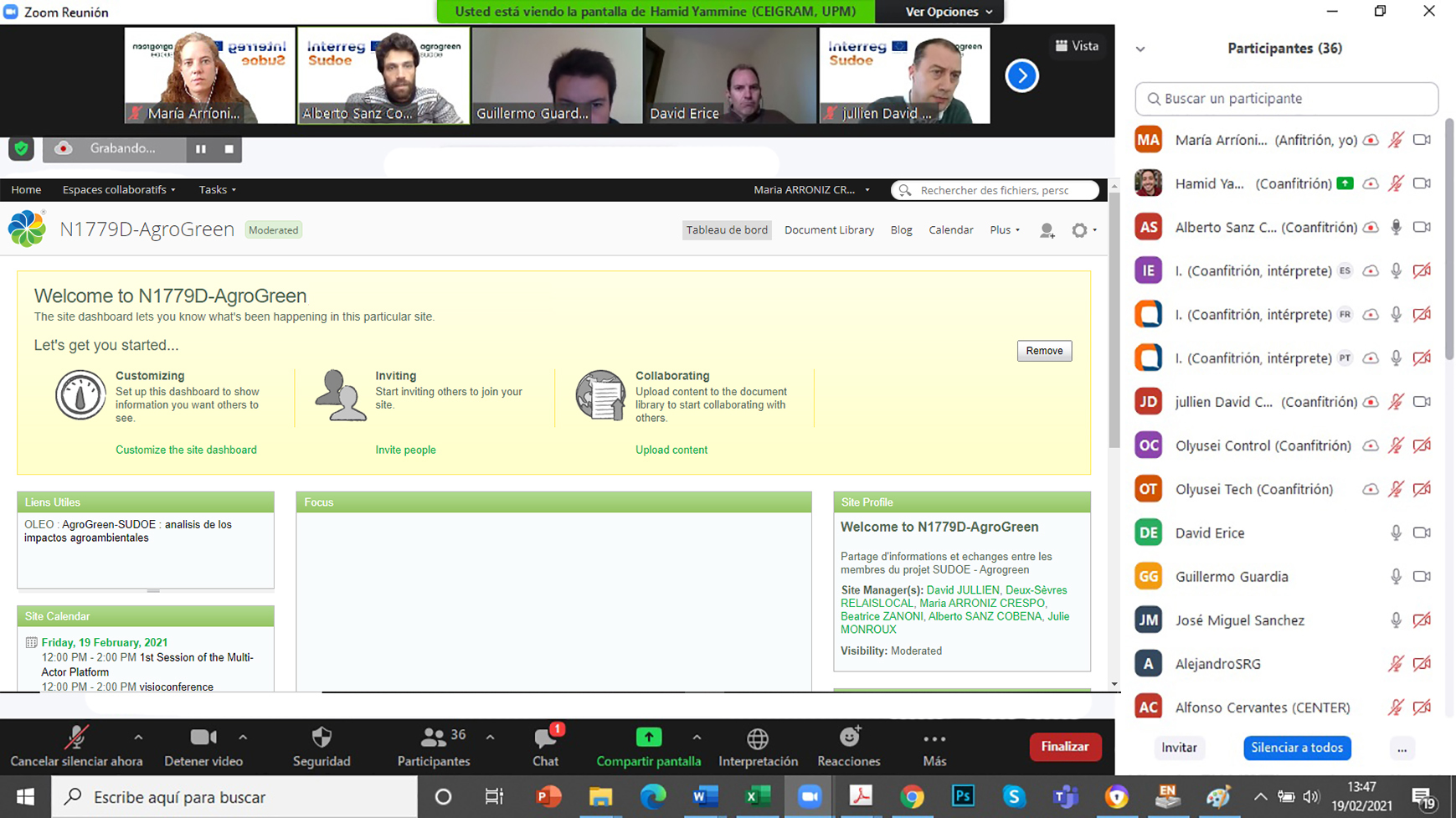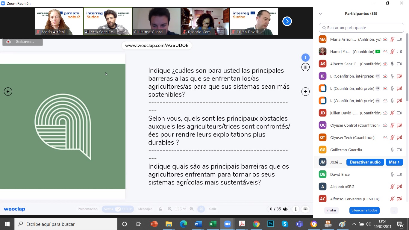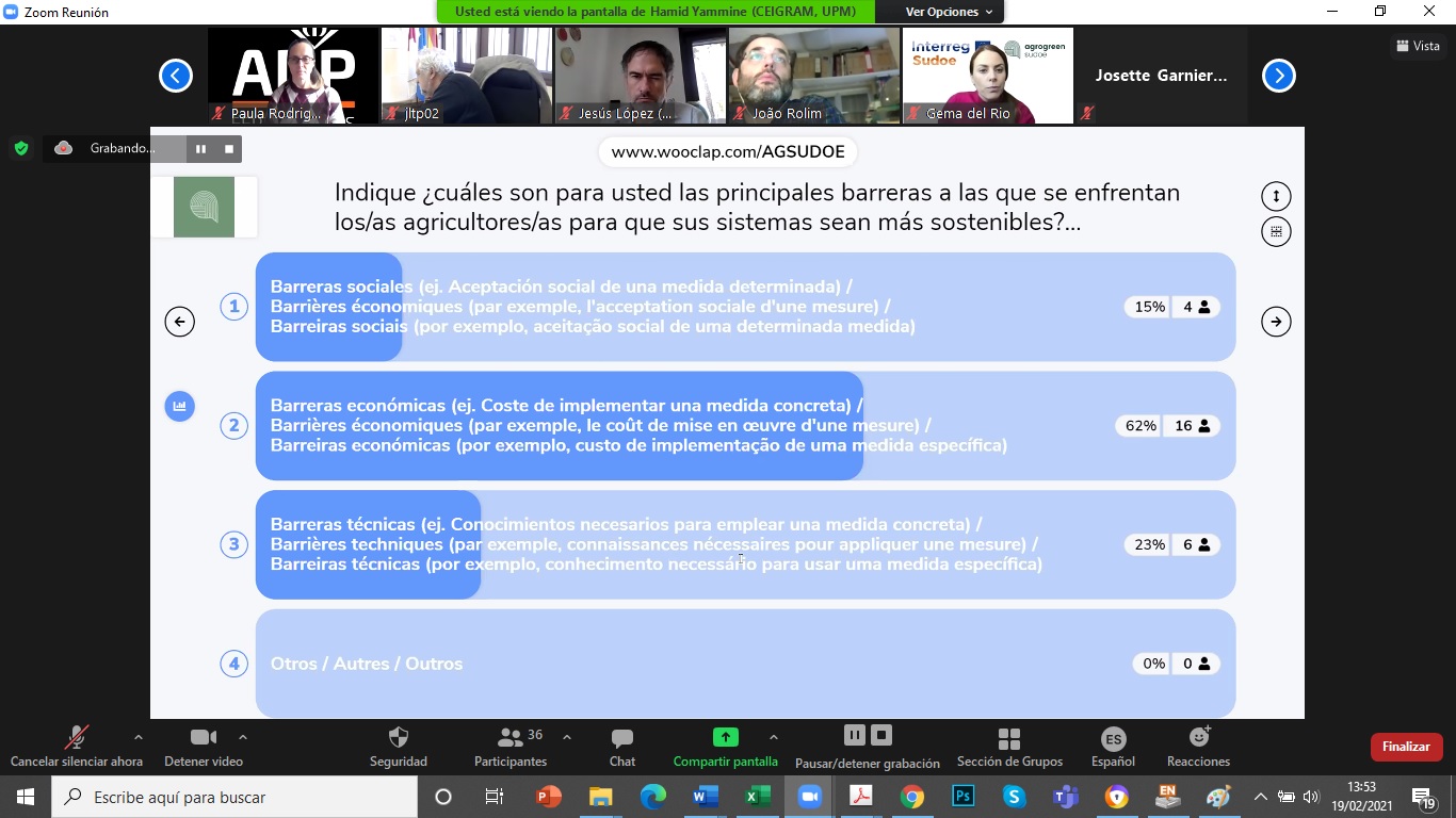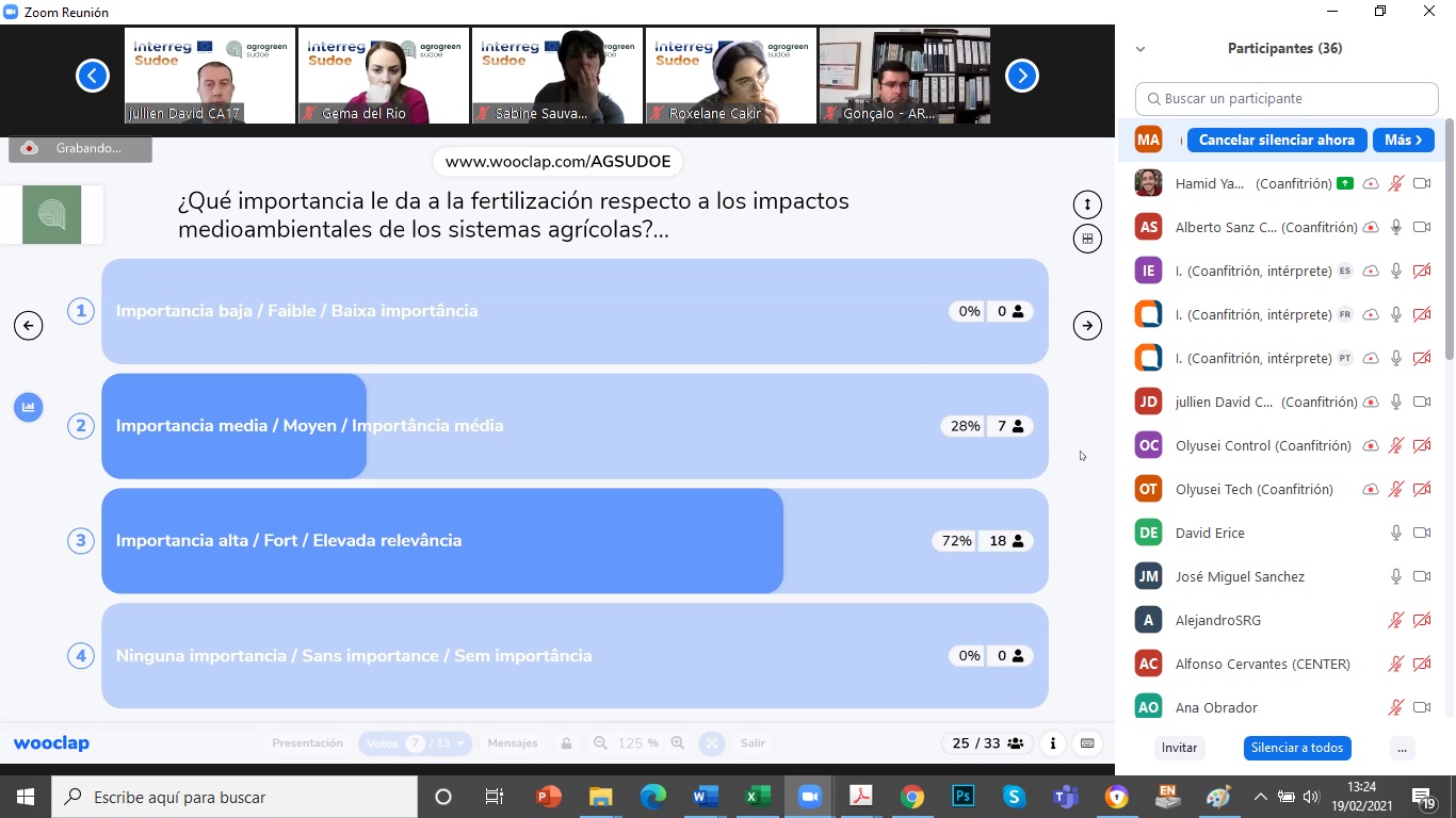 El pasado 19 de febrero tuvo lugar, de forma telemática, la primera reunión de la plataforma multi-actor AgroGreen-SUDOE de la que el CENTER forma parte como socio asociado. El proyecto busca desarrollar propuestas de manejo (como la fertilización y el riego) de sistemas de cultivo, que lleven a un impacto medioambiental mínimo de la actividad agrícola en el territorio SUDOE (España, Portugal y sur de Francia). El proyecto se desarrolla en el marco del Programa de Cooperación Interreg V-B Europa Suroccidental (SUDOE) y cuenta con una financiación de más de un millón de euros del Fondo Europeo de Desarrollo Regional (FEDER). La iniciativa está liderada por la Universidad Politécnica de Madrid (CEIGRAM) y se desarrollará, durante más de dos años, en los países antes mencionados. Esta primera sesión, comenzó con la explicación del manejo y funcionamiento de la Plataforma digital Multi-Actor para el intercambio de datos entre los socios. Posteriormente se inició la recogida de información proporcionada por los socios mediante una encuesta colaborativa. Esta información, pasará por un proceso de síntesis, generación de nuevos datos y estimación de impactos agroambientales mediante herramientas de modelización. El objetivo es incorporar la visión y sensibilidades de los principales actores implicados en el proceso de producción de alimentos de origen agrícola, así como en el desarrollo de políticas públicas en el ámbito agrícola y medioambiental. Interreg V Sudoe - Programa Interreg Sudoe - Inicio (interreg-sudoe.eu) Más información en: bzn-labocenter@mapa.es