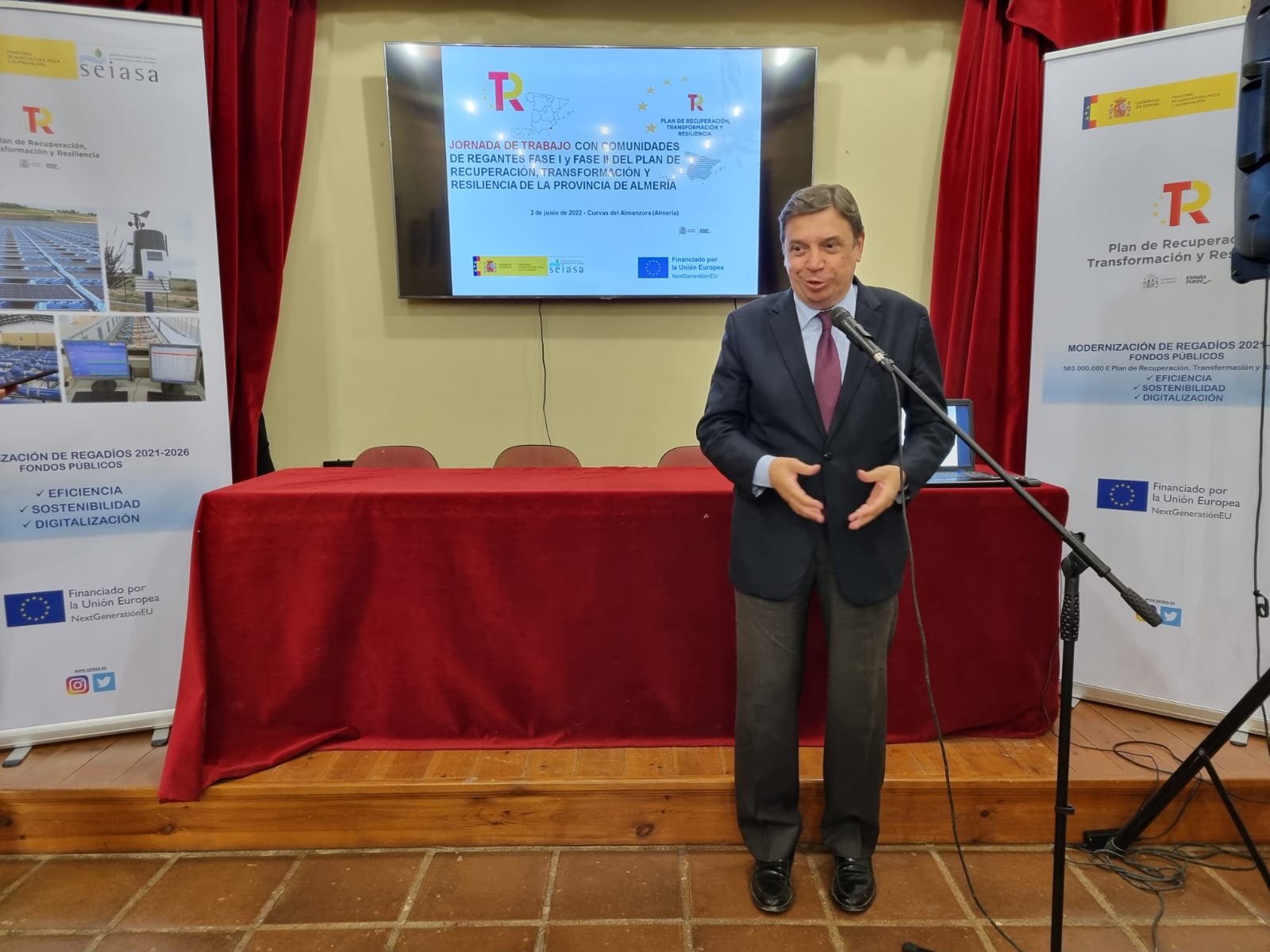 El ministro de Agricultura, Pesca y Alimentación, Luis Planas, ha mantenido hoy una reunión en Cuevas del Almanzora (Almería) con comunidades de regantes de la zona del levante almeriense que participan en los distintos proyectos de modernización de regadíos incluidos en el Plan de Recuperación, Transformación y Resiliencia (PRTR). Estos proyectos están cofinanciados con fondos públicos Next Generation de la Unión Europea (UE), hasta un máximo del 80 %, y por las propias comunidades de regantes.