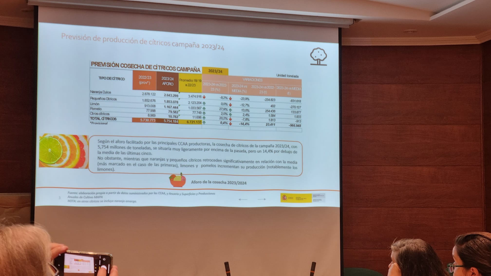 El aforo de cítricos elaborado por el Ministerio de Agricultura, Pesca y Alimentación arroja una previsión de producción de 5,754 millones de toneladas para la campaña 2023/2024, iniciada el pasado 1 de septiembre. El dato, obtenido a partir de la información que facilitan las principales comunidades autónomas productoras, suponen globalmente un incremento del 0,4 % sobre la campaña pasada, pero un 14,4 % por debajo de la media de los últimos cinco años. Será la segunda cosecha más corta de los últimos 11 años, tras la de la campaña pasada.