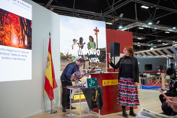 El punto final a esta jornada vino de la mano de Regina Domínguez, técnica de la Dirección de Turismo de la Junta de Extremadura que acudió al estand de Caminos Naturales para dar a conocer las bondades del Camino Natural Vía de la Plata. Y como una de las características que define Extremadura y el Camino Natural es su rica gastronomía, Regina se hizo acompañar por Francisco Javier Aguza Núñez, más conocido como “Macareno” que dio una masterclass sobre el Jamón Ibérico de Monasterio, realizando una cata comentada y dando a los y las presentes un montón de trucos para reconocer un buen jamón y, sobre todo, para conservarlo y cortarlo correctamente. Sin duda un broche de oro para el tercer día de feria.