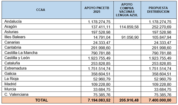 El Consejo de Ministros ha autorizado hoy la propuesta de distribución entre las comunidades autónomas de 7.400.000 euros para su aplicación en programas de erradicación de enfermedades de los animales. Una vez autorizado, la Conferencia Sectorial de Agricultura y Desarrollo Rural aprobará el reparto territorializado de los fondos. El objetivo de esta línea es Apoyo a la ejecución de programas que permitan el control y posterior erradicación de determinadas enfermedades de los animales de importancia por sus implicaciones en la sanidad animal y por las consecuentes repercusiones que pueden tener tanto en la salud pública como en las exportaciones de los productos ganaderos españoles. La mayor parte de los fondos a distribuir, 7.194.083,52 euros, corresponden al programa nacional de control y erradicación de la tuberculosis bovina, para compensar la falta de cofinanciación europea. El importe restante, 205.916,48 euros, se destina a Aragón y Baleares, las dos comunidades en las que este año se ha detectado la aparición de un nuevo serotipo de lengua azul y se emplearán en la adquisición de vacunas. La propuesta de distribución por comunidades autónomas que debe aprobar la Conferencia Sectorial es la siguiente: