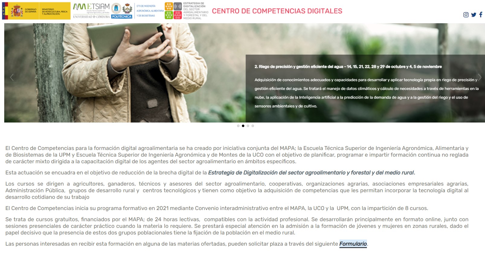 Con los cursos que se inician hoy, se pone en marcha la actividad formativa del Centro de Competencias Digitales, fruto del convenio de colaboración entre el MAPA, la Universidad de Córdoba y la Universidad Politécnica de Madrid, cuyo objetivo es reducir la brecha digital a través de la formación no reglada en materia de digitalización para profesionales del sector. Esta actuación, se enmarca dentro del II Plan de Acción 2021-2023 de la Estrategia de Digitalización del sector agroalimentario y forestal y del medio rural.