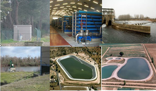 Azudes de derivación y captaciones fluviales: Los azudes permiten conseguir una ligera elevación de la lámina de agua en los ríos para facilitar su derivación hacia canales de riego en las vegas de los grandes ríos. Para la obtención de caudales de menor cuantía se suele disponer de otro tipo de estructura de captación en los cauces, fundamentalmente estaciones de bombeo, tomas directas o pozos marginales, en general de uso privado.