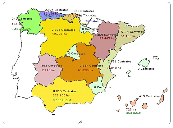 En el mapa que se muestra a continuación pueden verse los datos de Contratos, superficies y U.G.M acogidas a las practicas agroambientales durante el año 2001 (primer año de su aplicación en el presente periodo de programación).