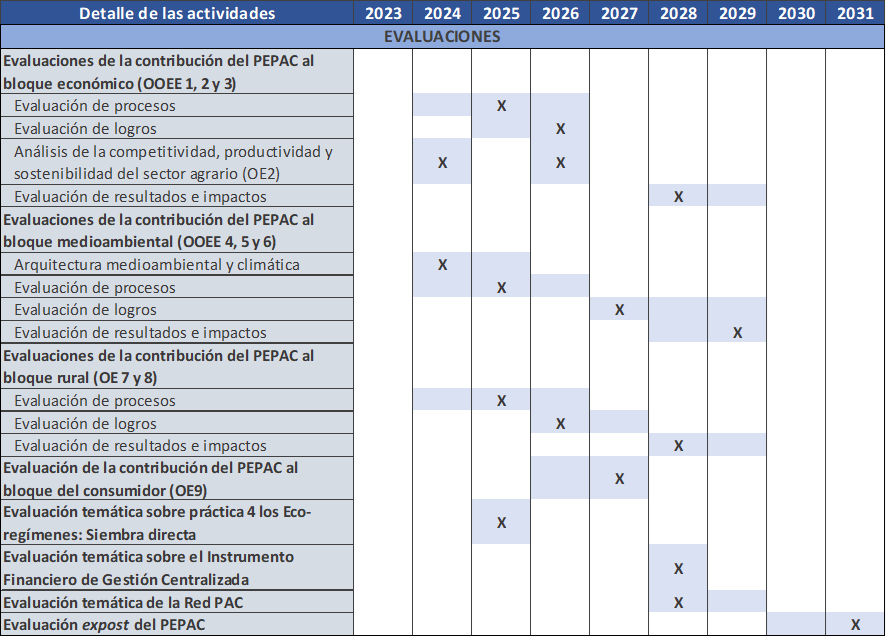 De acuerdo con el Plan de evaluación, se van a realizar las siguientes evaluaciones en el marco temporal tentativo que se indica en las tablas siguientes. Las evaluaciones que se desarrollen en el ámbito de PEPAC tienen un marco de la gobernanza diferente en función de los temas a evaluar. A continuación, se indican aquellas evaluaciones íntegramente desarrolladas por el equipo evaluador nacional. El papel de las regiones (autoridades regionales de gestión) será proporcionar la información necesaria previamente acordada.