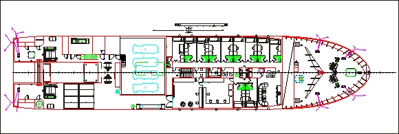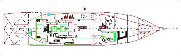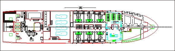 En la zona de popa y centro de popa se encuentran el parque de pesca y la sala donde se encuentran los grupos generadores. En el centro-proa la habilitación y los pañoles.
