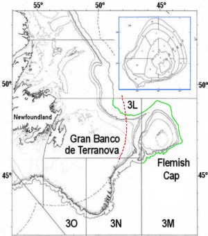 El banco Flemish Cap es un banco aislado de la plataforma costera americana con una superficie superior a las 10.000 millas cuadradas y se encuentra fuera de la Zona Económica Exclusiva de Canadá. La explotación de los recursos de este área se regula por los acuerdos internacionales de la NAFO.