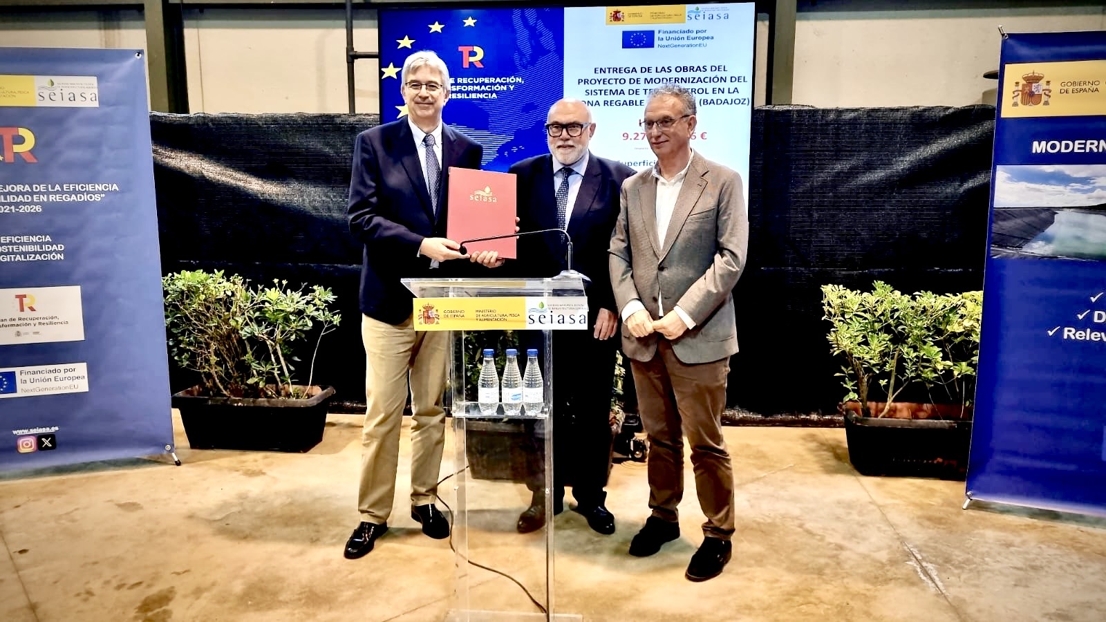 El Ministerio de Agricultura, Pesca y Alimentación (MAPA) ha entregado hoy a la Comunidad General de Regantes del Canal del Zújar la obra correspondiente a la modernización del sistema de telecontrol, valorada en 9,27 millones de euros. Esta actuación ha supuesto la renovación integral del sistema de telecontrol existente en las 20.695 hectáreas cultivadas por 7.240 regantes en los términos municipales de Villanueva de la Serena, Don Benito, Medellín, Mengabril, Valdetorres, Guareña, Oliva de Mérida, Villagonzalo, La Zarza y Alange (Badajoz). El proyecto ha consistido en la sustitución del Sistema de Telecontrol GPRS existente, a consecuencia de la obsolescencia de los equipos, por un nuevo sistema con tecnología de última generación, mediante protocolo de comunicaciones inalámbricas, que se sirve de la red de telefonía móvil para la comunicación y transmisión de señales. Además, se ha dotado al centro de control de nuevos equipos y herramientas para que la Comunidad de Regantes pueda gestionar la totalidad de su zona regable de forma mucho más eficiente y segura. Los regantes también disponen de una nueva aplicación APP para el control a distancia de sus hidrantes desde el móvil. Asimismo, en este proyecto se incluye la sustitución de 2.206 válvulas hidráulicas con contador que se encontraban averiadas, lo que venía produciendo errores de lectura que impedían a la Comunidad disponer de lecturas fiables de los volúmenes de agua consumidos. CAMPO SOLAR FOTOVOLTAICO Estas nuevas infraestructuras vienen a complementar las que entregara hace justo un año el MAPA, por valor de 5.464.368,52 euros (IVA incluido), y que dotó a la zona regable de energía solar fotovoltaica. Ambas actuaciones, con fondos del Plan de Recuperación, Transformación y Resiliencia (PRTR), han permitido a la Comunidad General reducir la dependencia energética de energías convencionales y mejorar la sostenibilidad ambiental y económica de las instalaciones de riego, gracias a una inversión, en conjunto, de 14.735.641,88 euros (IVA incluido).