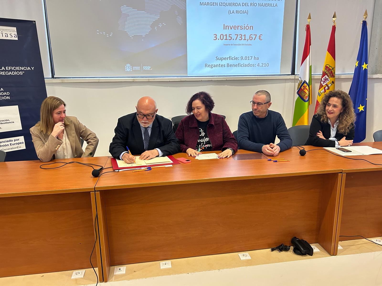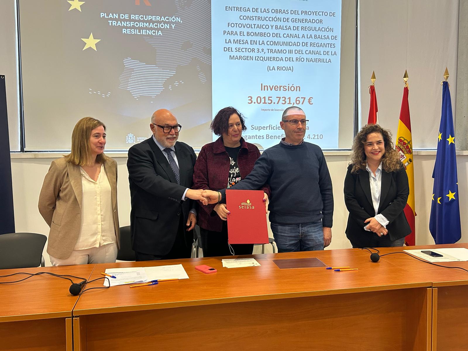 El Ministerio de Agricultura, Pesca y Alimentación, a través de la Sociedad Estatal de Infraestructuras Agrarias (Seiasa), ejecuta en la actualidad nuevas infraestructuras de riego por valor de 14 millones de euros en La Rioja, que permitirán ahorrar agua y energía a regadíos de la margen izquierda del río Najerilla. Se trata de dos actuaciones distintas. La primera cuenta con fondos del Plan de Recuperación, Transformación y Resiliencia y están cofinanciadas por fondos Next Generation de la Unión Europea. La segunda, tiene cofinanciación con cargo al Fondo Europeo Agrícola de Desarrollo Rural (FEADER), en el marco del Programa Nacional de Desarrollo Rural. La secretaria de Estado de Agricultura y Alimentación, Begoña García Bernal, ha subrayado durante la visita que ha realizado hoy a La Rioja que el regadío modernizado asegura el futuro de mujeres y jóvenes rurales, así como un sector eficiente, resiliente y adaptado a las tecnologías. ENTREGA DE OBRAS EN EL SECTOR 3º TRAMO III La secretaria de Estado ha hecho entrega a la Comunidad de Regantes del Sector 3º Tramo III del Canal de la Margen Izquierda del Río Najerilla de las obras de modernización ejecutadas y que incluyen, entre otros elementos, una nueva balsa de acumulación y tres campos solares fotovoltaicos. Las nuevas instalaciones, que permiten mejorar la eficiencia hídrica y energética de las explotaciones, han contado con una inversión de 3,01 millones de euros. La actuación beneficia a 4.210 regantes que cultivan 9.017 hectáreas en los municipios de Bañares, Baños de Rioja, Briones, Casalarreina, Castañares de Rioja, Cidamón, Gimileo, Haro, Ollauri, Rodezno, San Torcuato Tirgo, Villalobar de Rioja y Zarratón. Este proyecto se enmarca dentro del “Plan para la eficiencia y sostenibilidad en regadíos” del Plan de Recuperación, Transformación y Resiliencia Fase I y están cofinanciadas por fondos Next Generation de la Unión Europea. A PUNTO LA MODERNIZACIÓN EN ACEQUIA DE SAN ASENSIO Por otro lado, el Ministerio de Agricultura, Pesca y Alimentación, ultima la puesta en marcha y comprobación del funcionamiento de dos proyectos en la Comunidad de Regantes Acequia de San Asensio, Sector I Tramo III del Canal de la Margen Izquierda del Najerilla, que permiten a la zona regable contar con un moderno sistema de riego presurizado. Las nuevas infraestructuras, con una inversión de 11,03 millones de euros, benefician en este caso a 433 regantes que cultivan 1.366 hectáreas en los municipios de Honilleja, San Asensio y Torremontalbo, e incluyen, entre otros elementos, una nueva balsa de regulación y telecontrol GPRS. Estas actuaciones cuentan con cofinanciación con cargo al Fondo Europeo Agrícola de Desarrollo Rural, FEADER, en el marco del Programa Nacional de Desarrollo Rural. El Ministerio de Agricultura, Pesca y Alimentación tiene prevista para la comunidad autónoma de La Rioja una inversión, a través de Seiasa, de 77,96 millones de euros (IVA no incluido) para ejecutar un total de ocho actuaciones de modernización de regadíos sostenibles.