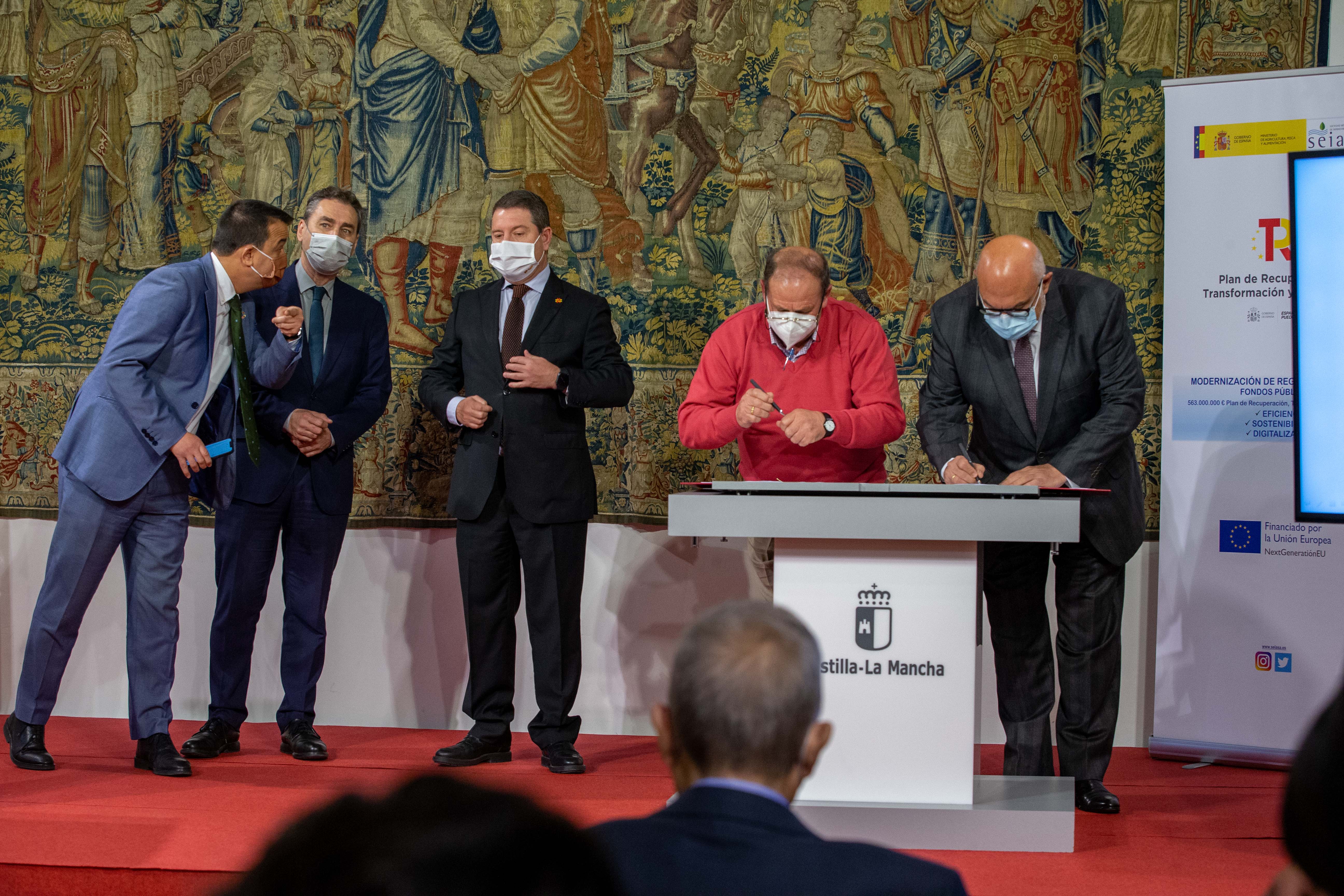 Para ello, el presidente de SEIASA, Francisco Rodríguez Mulero, ha firmado hoy en Toledo dos convenios con la Comunidad de Regantes de Balazote-La Herrera (Albacete) y con la Comunidad de Regantes del Pantano Estrecho de Peñarroya (Ciudad Real). El acto ha estado presidido por el presidente de Castilla-La Mancha, Emiliano García-Page y ha contado con la asistencia del delegado del Gobierno, Francisco Tierraseca Galdón. FOTOVOLTAICA EN BALAZOTE-LA HERRERA El “Proyecto de implementación de energías renovables mediante paneles fotovoltaicos flotantes en la Comunidad de Regantes de Balazote-La Herrera” cuenta con un presupuesto de 2.522.800 euros (IVA no incluido), afectará a una superficie de 5.580 hectáreas y beneficiará a 445 regantes de los municipios de Balazote, La Herrera y Lezuza, en la provincia de Albacete. La actuación comprende una instalación fotovoltaica que fomentará la mejora de la eficiencia energética, a través del empleo de energías renovables, y que supondrá una reducción de la emisión de gases de efecto invernadero y del gasto económico de los regantes. NUEVA CONDUCCIÓN CON PEÑARROYA El “Proyecto de conexión hidráulica directa de las redes de riego de las balsas 1 y 2 con el embalse de Peñarroya” supondrá una inversión de 21.200.000 euros (IVA no incluido), afectará a 7.842 hectáreas y beneficiará a 2.000 regantes de los municipios de Argamasilla de Alba, Tomelloso y Campo de Criptana, en la provincia de Ciudad Real. El objetivo de la actuación es aprovechar la energía hidráulica disponible en el embalse para regar, reduciendo o evitando la necesidad de bombeo desde las balsas. Para ello se realizará la conexión hidráulica directa desde el embalse mediante una nueva conducción, obteniendo la presión suficiente y reduciendo la necesidad de bombeo y con ello el consumo de energía eléctrica. A la vez se evitarán las actuales pérdidas de agua que se realiza a través de canales. En ambos casos y teniendo en cuenta que las inversiones del “Plan para la mejora de la eficiencia y la sostenibilidad en regadíos” tienen carácter público-privado, la aportación del Plan de Recuperación, Transformación y Resiliencia será de un máximo del 80 % del coste de los gastos elegibles, mientras que las comunidades de regantes y usuarios objeto de la actuación aportarán el resto. 36,39 MILLONES DE EUROS EN CASTILLA-LA MANCHA (FASES I Y II) Rodríguez Mulero ha recordado que, en el marco del “Plan para la mejora de la eficiencia y la sostenibilidad en regadíos” del Plan de Recuperación Fase II, han sido preseleccionadas otras cuatro actuaciones por valor de 12,66 millones de euros, lo que sumaría una inversión en conjunto en Castilla-La Mancha de 36,39 millones de euros en esta materia.
