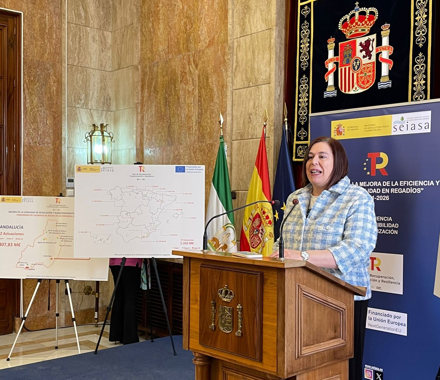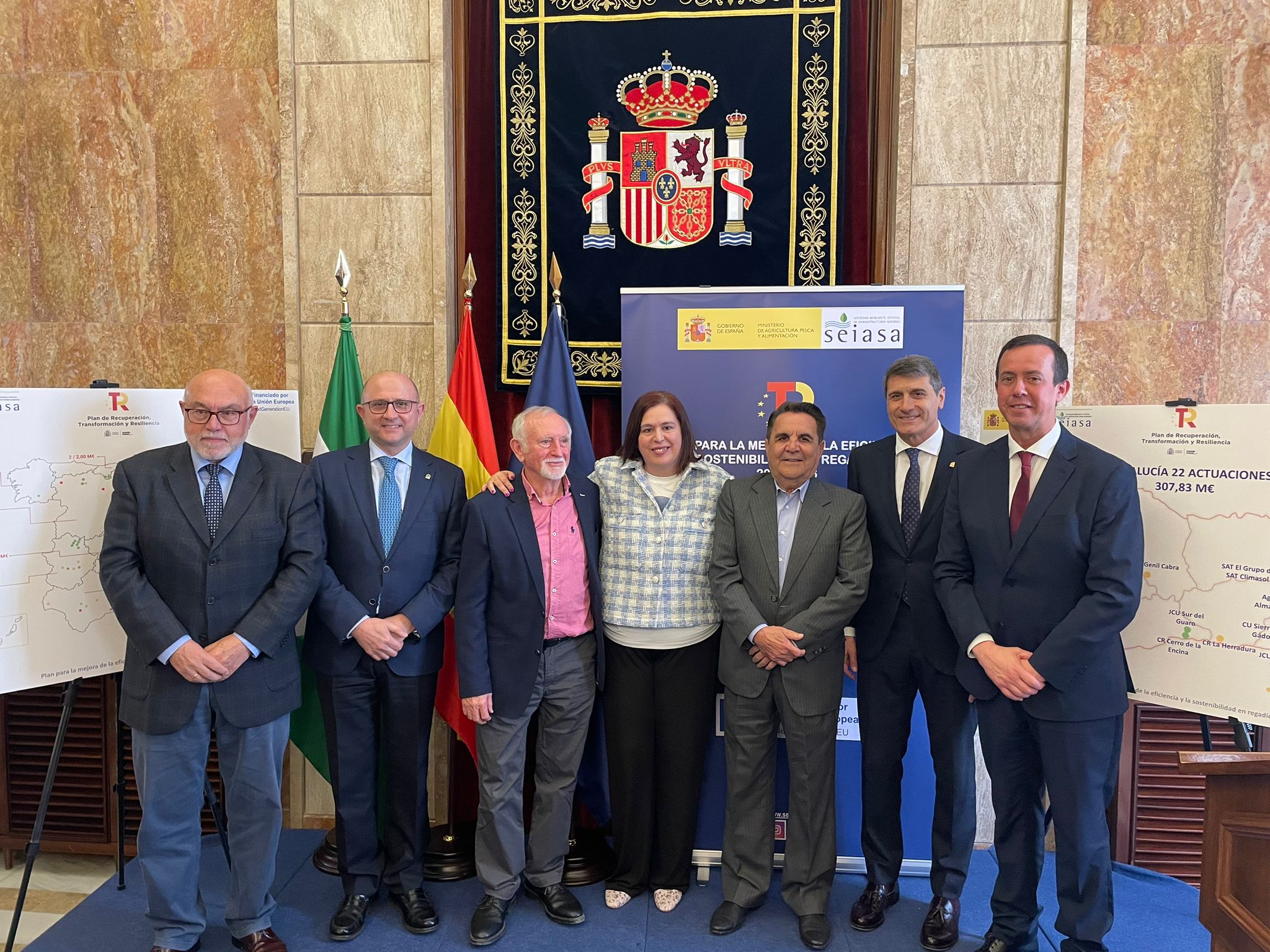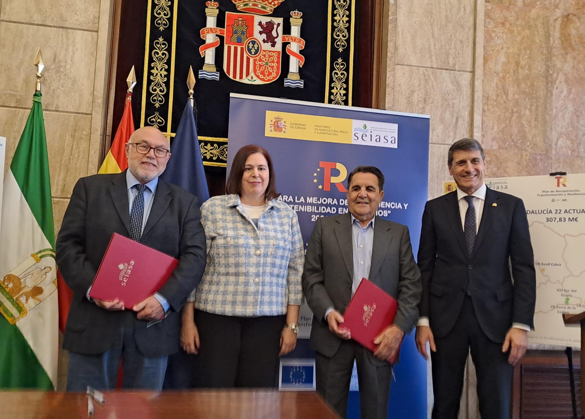 Las actuaciones refrendadas en los tres convenios beneficiarán a 18.000 hectáreas y a más de 6.200 regantes. Todo ello enmarcado en el Plan de Recuperación, Transformación y Resiliencia (PRTR). El acto ha estado presidido por la secretaria de Estado de Agricultura y Alimentación, Begoña García Bernal, y ha contado con la presencia del delegado del Gobierno en Andalucía, Pedro Fernández Peñalver, y el subdelegado del Gobierno en Almería, José María Martín Fernández. La secretaria de Estado ha defendido la herramienta “tan significativa” que son las aguas regeneradas, “una oportunidad de oro para territorios como Almería, donde cada gota cuenta, donde el buen uso de un recurso tan escaso y valioso permite una transformación radical gracias al suministro constante, eficiente y sostenible”. Asimismo, ha incidido en que la utilización de aguas desaladas “es un método imprescindible para avanzar en la sostenibilidad ambiental de los regadíos, garantizar el abastecimiento y combatir la sequía”. España se sitúa a la cabeza de Europa en producción de agua desalada y es el cuarto país del mundo en capacidad instalada, con una producción diaria de cerca de 5 millones de metros cúbicos para abastecimiento, riego y uso industrial. “España es, a nivel mundial, un ejemplo de regadío con agua desalada”, ha afirmado la secretaria de Estado. Más del 21 % del agua desalada en el país va destinado a la agricultura. GARANTÍA DE RIEGO EN NÍJAR El proyecto de mejora de la capacidad de regulación y almacenamiento de agua desalada en la comunidad de usuarios de aguas de la Comarca de Níjar cuenta con un presupuesto de 11.400.000 euros (IVA incluido), beneficiará a 2.500 regantes y actuará sobre una superficie de 10.100 hectáreas en los municipios de Níjar, Almería, Lucainena de Las Torres y Sorbas. El objetivo de la actuación es garantizar el suministro de agua desalada, al evitar las restricciones en algunas épocas del año y aumentar el consumo aguas no convencionales, lo que disminuye las actuales extracciones del acuífero que abastece la zona y favorece su recuperación. La actuación comprende la ejecución de dos balsas de regulación, estaciones de bombeo, plantas fotovoltaicas para autoconsumo y las conexiones con las redes ya existentes. AGUA DESALINIZADA Y REGENERADA EN EL PONIENTE La inversión para el proyecto de modernización de la zona regable Tierras de Almería asciende a 30.000.000 euros (IVA no incluido) y permitirá la modernización de 2.800 hectáreas que cultivan 890 regantes en el municipio de El Ejido. El objetivo de la actuación es el aprovechamiento de las aguas de la desaladora del Campo de Dalías en las comunidades de base de la junta central de usuarios del acuífero del poniente almeriense, en la que se integra la zona regable Tierras de Almería, reduciendo así las extracciones de las aguas subterráneas. La actuación comprende la ejecución de nuevas conducciones primarias y secundarias hasta los hidrantes para el transporte de aguas convencionales y no convencionales, así como dos balsas y un sistema de telecontrol. También dentro de esta zona regable, el tercero de los convenios firmados hoy supondrá la ejecución del proyecto de obras complementarias para el aprovechamiento del agua regenerada de la estación depuradora de aguas residuales (EDAR) de El Ejido. En este caso, la actuación cuenta con un presupuesto de 19.000.000 millones de euros (IVA no incluido) y beneficiará a 2.821 regantes y 5.133 hectáreas en El Ejido. Las nuevas infraestructuras permitirán el aprovechamiento del agua regenerada de la EDAR de El Ejido para el riego y prevén la construcción de una balsa de regulación y un parque solar fotovoltaico, entre otros elementos. ANDALUCÍA: 355,33 MILLONES DE EUROS EN MODERNIZACIÓN