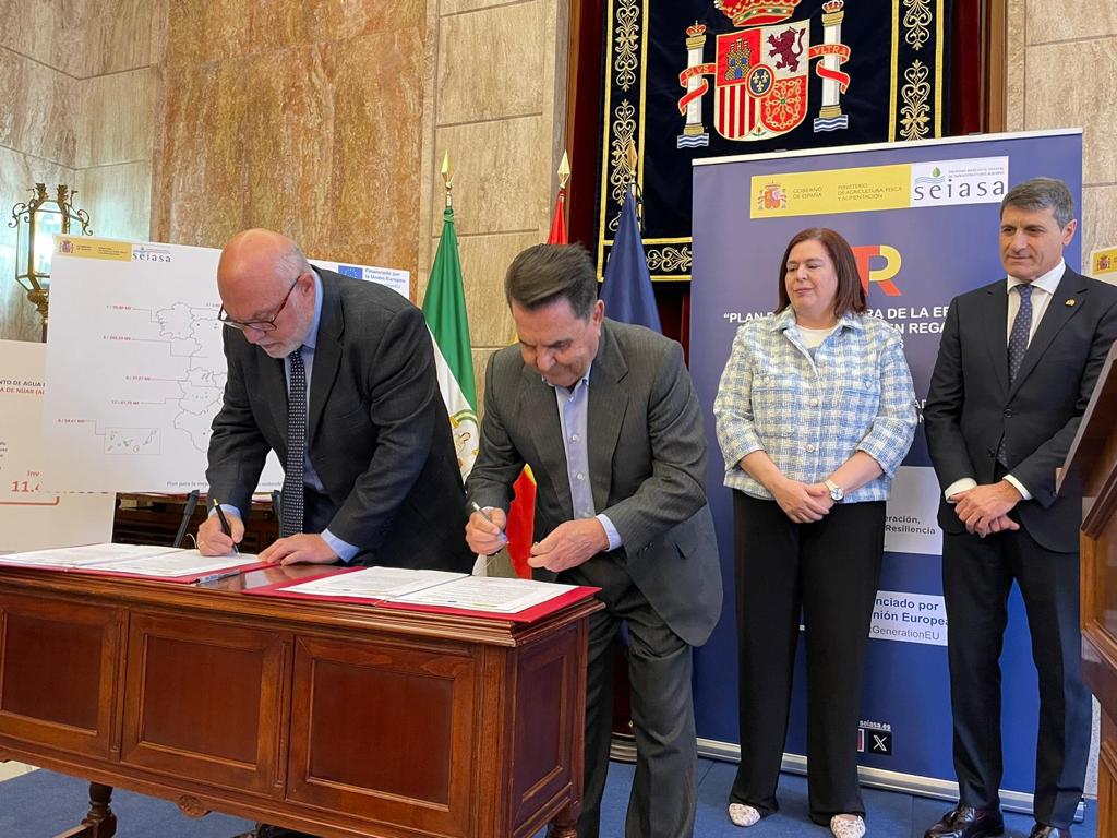 El Ministerio de Agricultura, Pesca y Alimentación ha formalizado esta mañana, en Almería, tres convenios de colaboración con las comunidades de usuarios del acuífero del poniente almeriense y de la comarca de Níjar, para construir unas infraestructuras que garanticen el riego con aguas no convencionales en estas zonas regables de la provincia almeriense, con una inversión de 60,4 millones de euros (IVA no incluido).