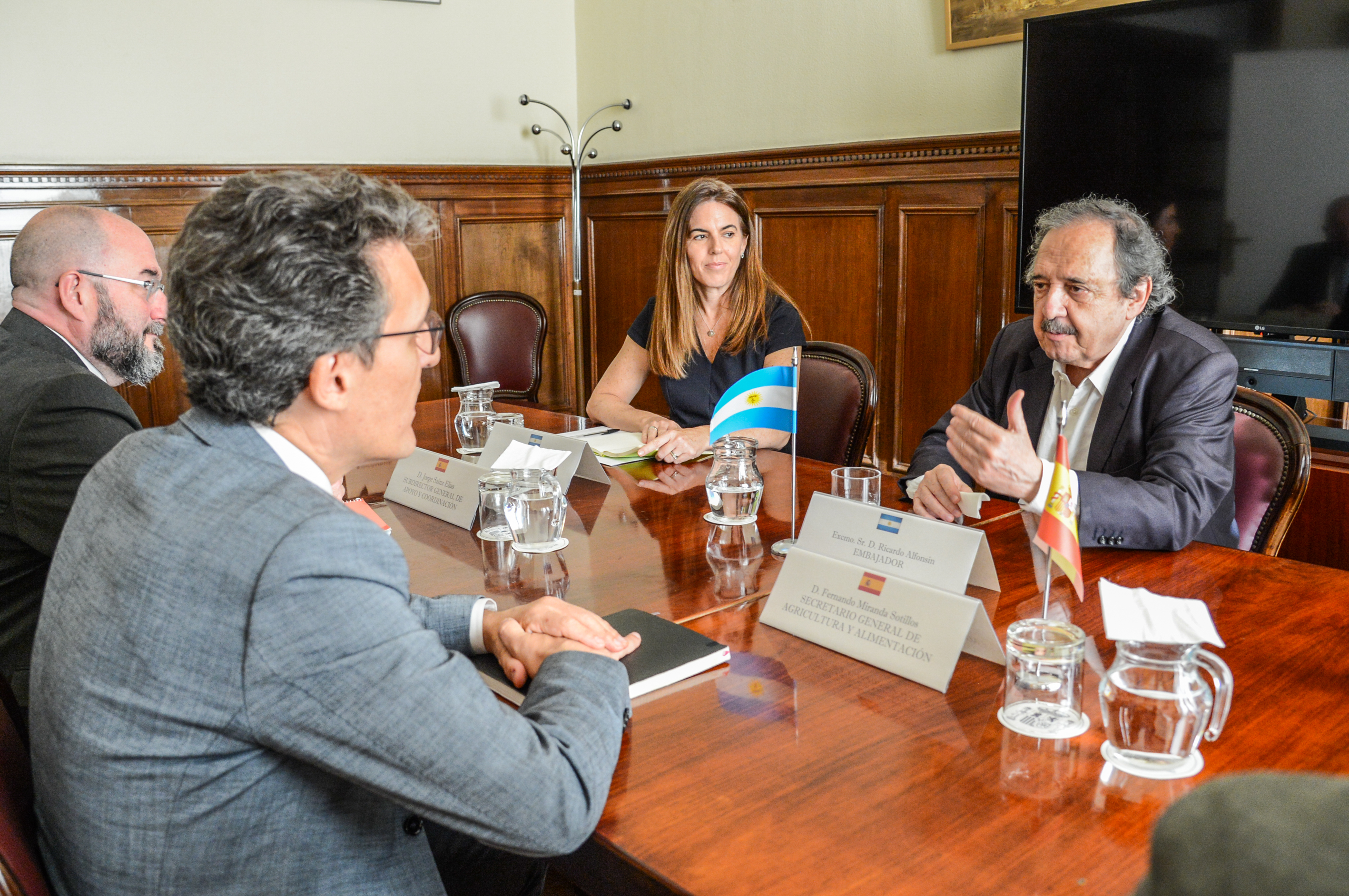El secretario general de Agricultura y Alimentación, Fernando Miranda, se ha reunido hoy, en la sede del ministerio, con el embajador de la República Argentina, Ricardo Alfonsín, con quien ha abordado asuntos de interés bilateral en materia agroalimentaria.