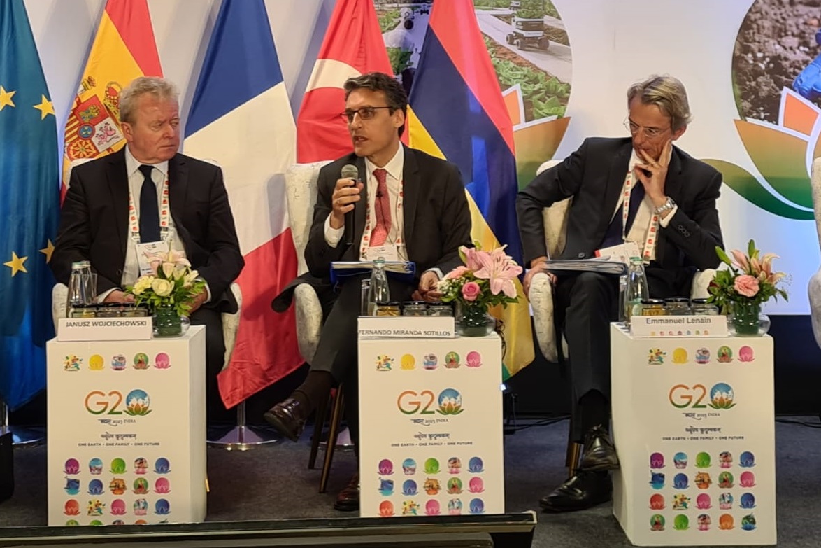 En la reunión ministerial de Agricultura del G20, que se celebra entre los días 15 al 17 de junio en Hyderabad (India), Fernando Miranda se ha referido en particular a la importancia del acuerdo para la exportación de grano de Ucrania a través del mar Negro, que estará vigente hasta el 18 de julio tras la última prórroga pactada con Rusia. En la reunión de Hyderabad se pretende trazar una hoja de ruta para mejorar la seguridad alimentaria y la nutrición a nivel mundial, reforzar los esfuerzos internacionales para lograr sistemas agroalimentarios sostenibles y hacer que los medios de vida agrícolas sean inclusivos, equitativos y económicamente viables para los productores. En esta edición, al igual que en la edición anterior, bajo presidencia indonesia, el consenso plantea dificultades en relación con las consecuencias sobre los sistemas alimentarios de la guerra de agresión de Rusia contra Ucrania. El secretario general ha valorado los esfuerzos realizados por India, que ostenta la presidencia de turno del foro de Agricultura, para avanzar en las negociaciones en el seno del G20. Fernando Miranda ha puesto de manifiesto que las invasión rusa de Ucrania ha venido a agravar los problemas a los que se enfrenta la alimentación a nivel global y ha provocado una disrupción en el comercio de alimentos y fertilizantes. Hay una situación de gran volatilidad, con un incremento de los precios de los inputs y de los alimentos, con consecuencias que se hacen sentir en todos los países, particularmente en los más vulnerables por ser más dependientes de la importación de alimentos. La presidencia india ha identificado cuatro áreas prioritarias para mantener debates y buscar consensos, concretamente: Seguridad alimentaria y nutrición; Agricultura sostenible con un enfoque climático inteligente; Cadenas de valor agrícolas y sistemas alimentarios inclusivos; y Digitalización para la transformación agrícola. En la sesión de tarde, el secretario general de Agricultura ha participado en una mesa redonda sobre la preservación de la biodiversidad y los servicios escosistémicos y la seguridad alimentaria, en la que ha subrayado el papel de la Política Agraria Común (PAC), a través de la condicionalidad y los ecorregímenes, para promover una agricultura adaptada a las condiciones climáticas de sostenibilidad y rentable para los agricultores. A este respecto, ha subrayado la necesidad de contar con los agricultores a través de la formación y la transferencia del conocimiento para facilitar el cambio hacia prácticas más eficientes económica y medioambientalmente. REUNIÓN MINISTERIAL DE AGRICULTURA DEL G20 Además de buscar nuevos ámbitos de cooperación, en la reunión del G20 se pasa revista a los avances logrados en las iniciativas impulsadas en ediciones anteriores y se intenta adoptar un comunicado de consenso. La formación agraria del G20 ha contribuido a lo largo de los años a la consolidación de diversas iniciativas que contribuyen a la cooperación internacional en estas materias. Tal es el caso del Sistema de Información de Mercados Agrícolas (AMIS), el Grupo de Observaciones de la Tierra Iniciativa de Monitoreo Agrícola Global (GEOGLAM), la Iniciativa Trigo, la Plataforma de Agricultura Tropical (TAP), la Plataforma para la Gestión de Riesgos Agropecuarios (PARM), y la Plataforma Técnica sobre la Medición y Reducción de la Pérdida y el Desperdicio de Alimentos (TPFLW). En su última edición en 2022, la formación agraria del G20 encargó a la Organización de Naciones Unidas para la Alimentación y la Agricultura (FAO), el Banco Mundial y la Organización Mundial del Comercio (OMC) un estudio para repasar y evaluar las repuestas que desde diferentes instituciones se daban a los problemas de seguridad alimentaria derivados de la pandemia y de la guerra de Ucrania. Ese documento vio la luz el pasado mes de abril, y será también examinado en la reunión. El documento, en inglés, está disponible en el siguienteenlace: https://www.fao.org/3/cc5392en/cc5392en.pdf