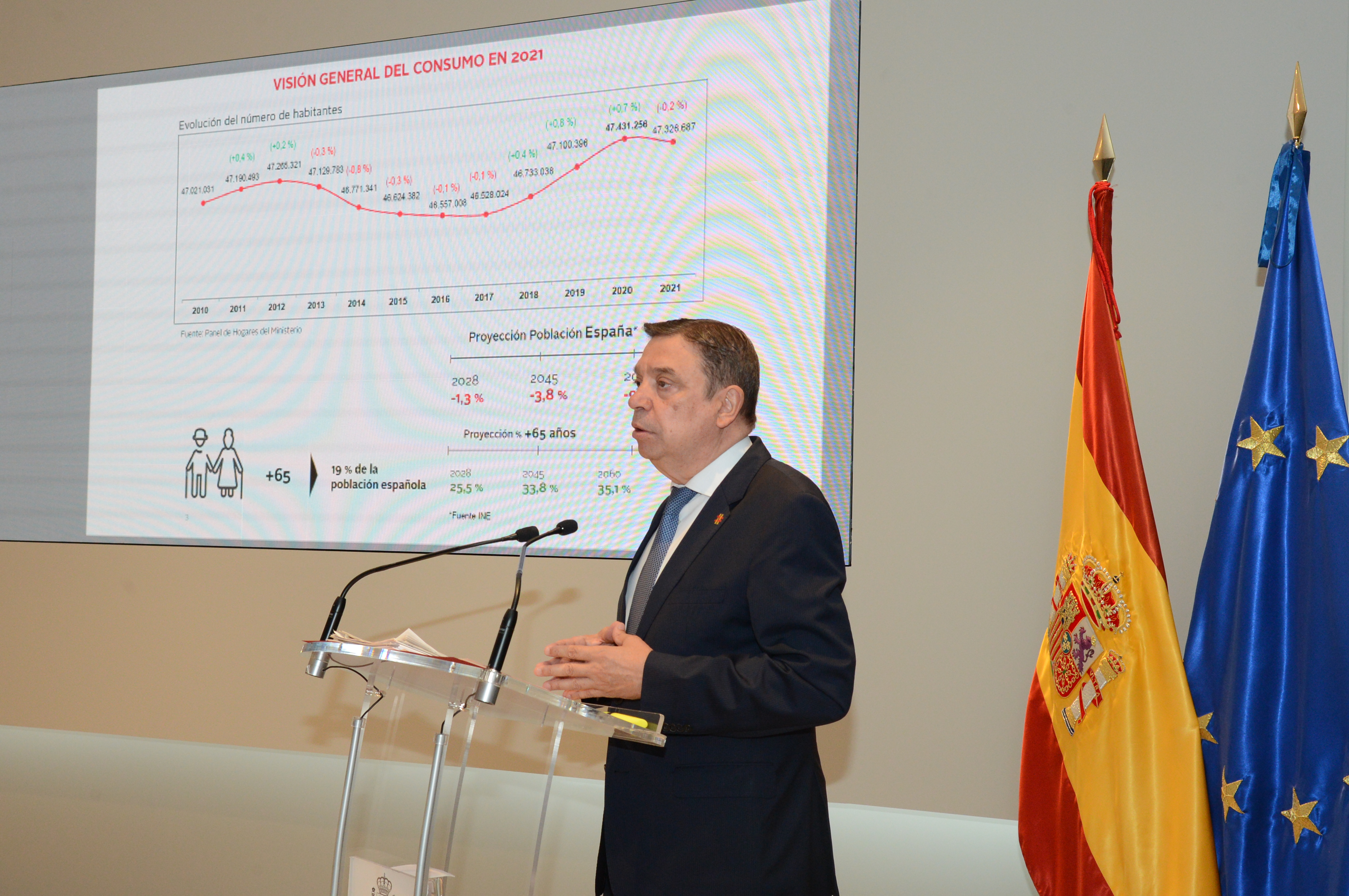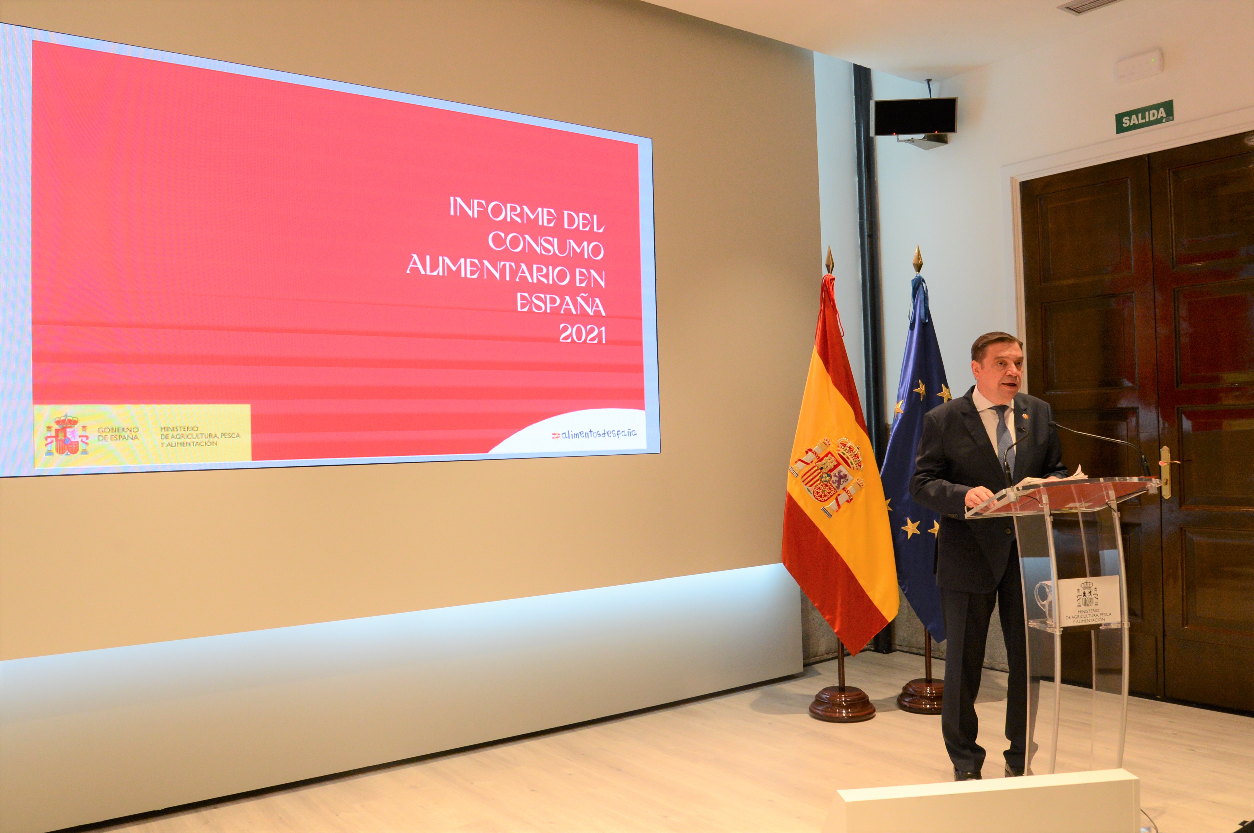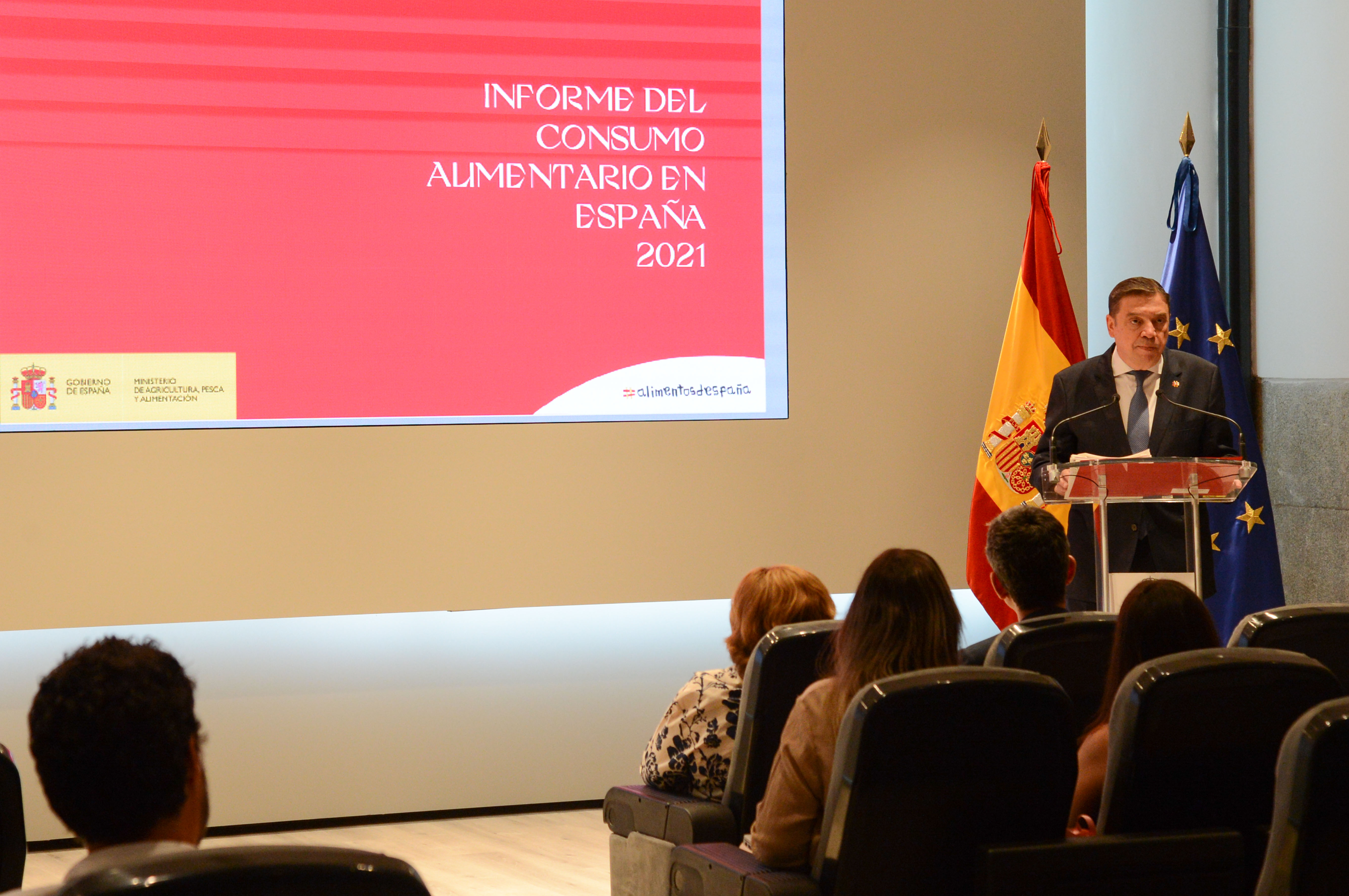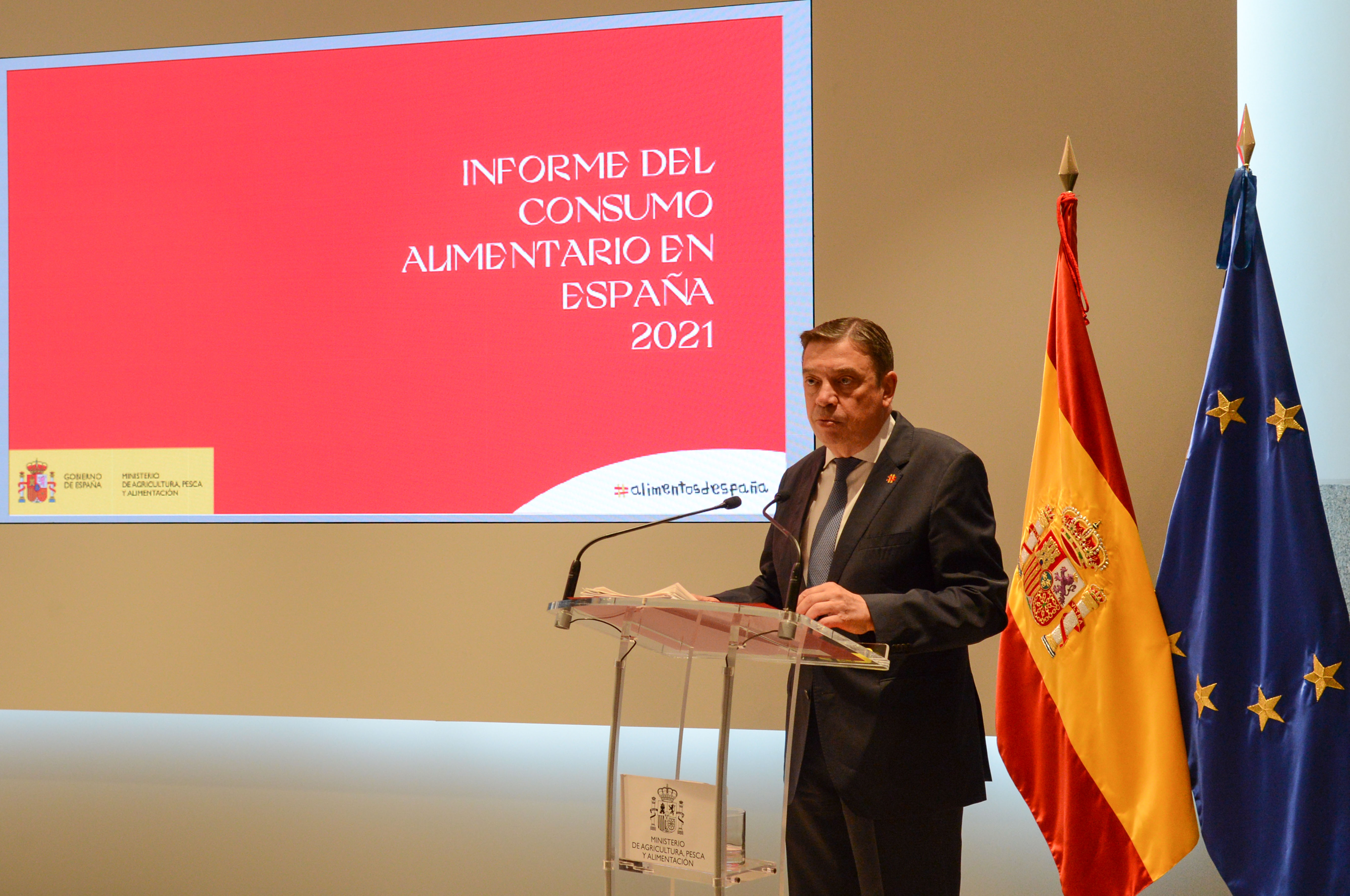 El ministro de Agricultura, Pesca y Alimentación, Luis Planas, ha presentado hoy el “Informe del consumo alimentario en España 2021”, donde ha valorado que la cadena de suministro de los alimentos sigue respondiendo de manera ejemplar, al garantizar el abastecimiento en los momentos de crisis.