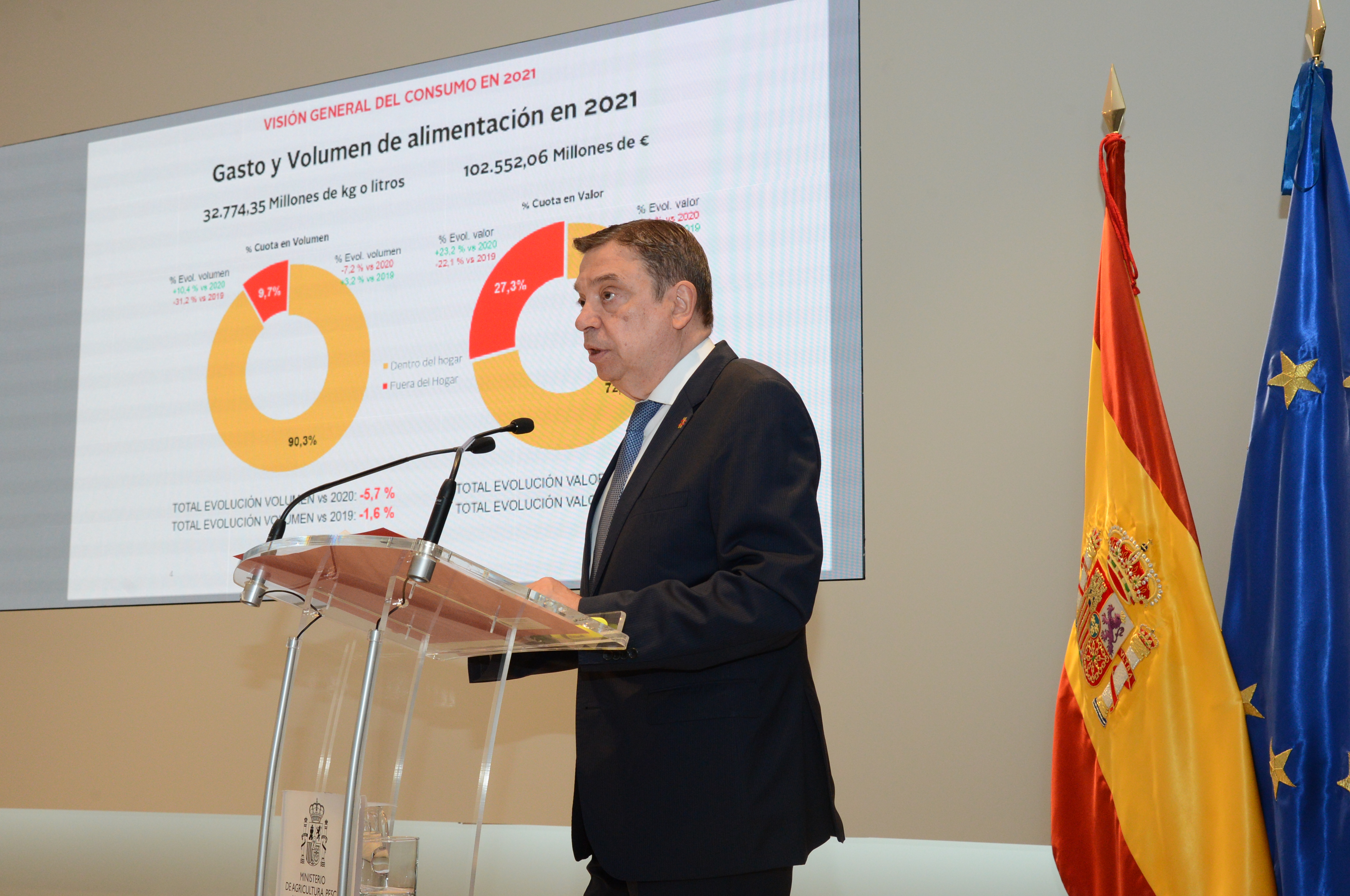 CONSUMO EN LOS HOGARES Según ha precisado el ministro, el gasto realizado por los españoles para el abastecimiento en el hogar ascendió en 2021 a 74.543 millones de euros, con un descenso del 6,1 % respecto a 2020 y un crecimiento del 7,3 % en relación a 2019. En volumen, los españoles consumieron en el hogar 29.586 millones de kilos/litros, un 7,2 % menos que en 2020. En el año 2021, los productos frescos representan la parte más importante del consumo doméstico, con un 38,8 % en volumen y un 42,3 % en valor. Los productos de mayor volumen en la cesta de la compra son los lácteos, frutas y hortalizas frescas, que suman el 40,6 % del total de compras. Mientras, carnes y pescados suponen el 33 % del presupuesto destinado a alimentación, aunque en volumen solo representan el 10,6 % de los kilos consumidos. En el hogar, el consumo per cápita en 2021 ha sido de 639 kilos y un gasto de 1.610 euros por persona y año. Con carácter general, las regiones del norte de España, Murcia y Baleares registran consumos y gastos per cápita superiores a la media. Respecto a los canales de abastecimiento, el supermercado sigue siendo el lugar preferido por los españoles para realizar sus compras, con casi la mitad del volumen total de ventas, cifras que no varían mucho respecto del año anterior. En este ámbito, las tiendas tradicionales han visto disminuir su cuota de mercado, tras el impulso generado en 2020 gracias a su papel destacado durante la pandemia como comercio de cercanía. También destaca la continuidad en la senda de crecimiento de las compras por Internet, que logran una cuota del 2,4 % sobre el total de la alimentación. Como información adicional, Planas ha hecho mención a la compra de productos sin gluten, que suponen el 3,3 % del volumen total de alimentación, mientras que otro 2,3 % corresponde a productos de elaboración ecológica. CONSUMO EXTRADOMÉSTICO Por otra parte, el ministro ha señalado que la recuperación de la normalidad, tras las dificultades de la crisis sanitaria, consolida el crecimiento del consumo fuera del hogar. Ello conlleva que los datos de consumo extradoméstico de 2021 sean positivos, aunque negativos respecto a la situación de normalidad de 2019. Así, el gasto realizado por los españoles en alimentación y bebidas fuera de casa ascendió en 2021 a 28.008 millones de euros, un 23,2 % superior al año anterior, pero un 22,1 % inferior al valor alcanzado durante 2019. En volumen, el consumo equivale a 3.187 millones de kg/l, en cerca de 11.773 millones de consumiciones, con un incremento del 10,4 % sobre el año anterior, pero lejos del consumo que se producía antes de la pandemia (-31,2 % respecto a 2019). Fuera del hogar, los ciudadanos han consumido mayor volumen de bebidas (67,7 %) que de alimentos (32,3 %). No obstante, durante el año 2021 ha aumentado más el consumo de alimentos que de bebidas con respecto al año anterior (+13 % y -7,2 %, respectivamente). Posiblemente, la vuelta a la normalidad ha ocasionado que los españoles hagan más completas sus consumiciones fuera del hogar. En valor, un 63,9 % del consumo corresponde a los alimentos y un 36,1 % a las bebidas. El consumo medio per cápita en 2021 fue de 92,75 kg/l, 7,99 kilos más que en 2020, aunque todavía suponen 43,86 kilos menos con respecto a 2019. Mientras, el gasto per cápita fue de 814,97 euros, un 22,1 % más que el año anterior, aunque inferior a lo gastado en 2019 (1.060 euros por persona). El ministro ha señalado que en 2021 hemos intensificado el consumo en los establecimientos, aunque se está consolidando la venta a domicilio de alimentos. Planas ha apuntado que, tras la experiencia adquirida durante el confinamiento, “bares y restaurantes se tuvieron que reinventar para entregar a domicilio sus productos y esa tendencia ha llegado para quedarse”. Por canales de compra, bares, cafeterías y cervecerías concentran el 42,8 % del volumen consumido fuera de casa, seguidos de restaurantes (28,7 %). También aumentan las compras en hoteles y servicios de empresa, síntoma de la recuperación de los hábitos sociales. USOS, HÁBITOS Y TENDENCIAS El informe señala que, tras el boom experimentado por la cocina casera durante la pandemia, en 2021 los ciudadanos han dedicado menos tiempo a cocinar, tanto entre semana como el fin de semana, debido en gran medida a la recuperación del consumo extradoméstico y una mayor presencia en los centros de trabajo. Cada vez son más numerosas las opciones de preparación menos elaboradas, como el plato único, que alcanza un 60,8 % de las ocasiones de consumo. Además, los métodos de cocinado rápidos y saludables siguen siendo los preferidos: plancha, sin cocinar/frío o los hervidos, en detrimento de los platos guisados, al horno o fritos. Por otra parte, el ministro ha explicado que, debido al impacto que la actual coyuntura de incremento de los precios o el conflicto de Ucrania están teniendo en la compra de alimentos, el ministerio está realizando un seguimiento pormenorizado de la situación. Así, entre finales de febrero y principios de marzo se ha detectado un aumento de compras de acopio, ante el temor a una posible falta de suministro. Las variaciones más altas se han producido en compras de alimentos fáciles de almacenar y conservar, como aceite de oliva y girasol (59,6 % y 45,2 %, respectivamente), y también de productos básicos como harinas, sémolas, pasta y arroz.
