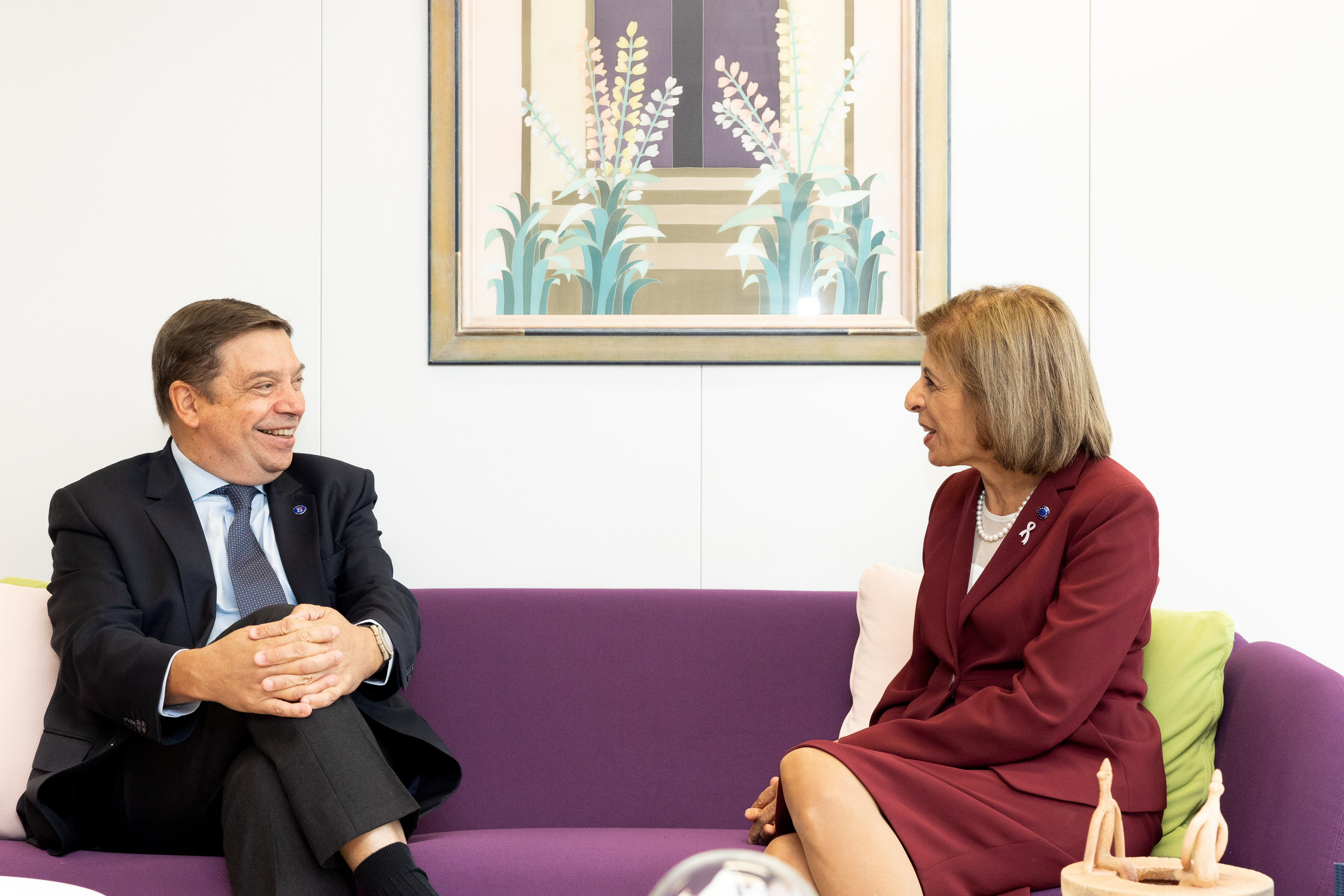 El ministro de Agricultura, Pesca y Alimentación en funciones, Luis Planas, se ha reunido hoy en Bruselas con la comisaria de Salud y Seguridad Alimentaria, Stella Kyriakides, para tratar aspectos relacionados con los expedientes en los que trabaja durante este semestre la Presidencia española del Consejo de la Unión Europea, así como otros asuntos del sector agroalimentario español.