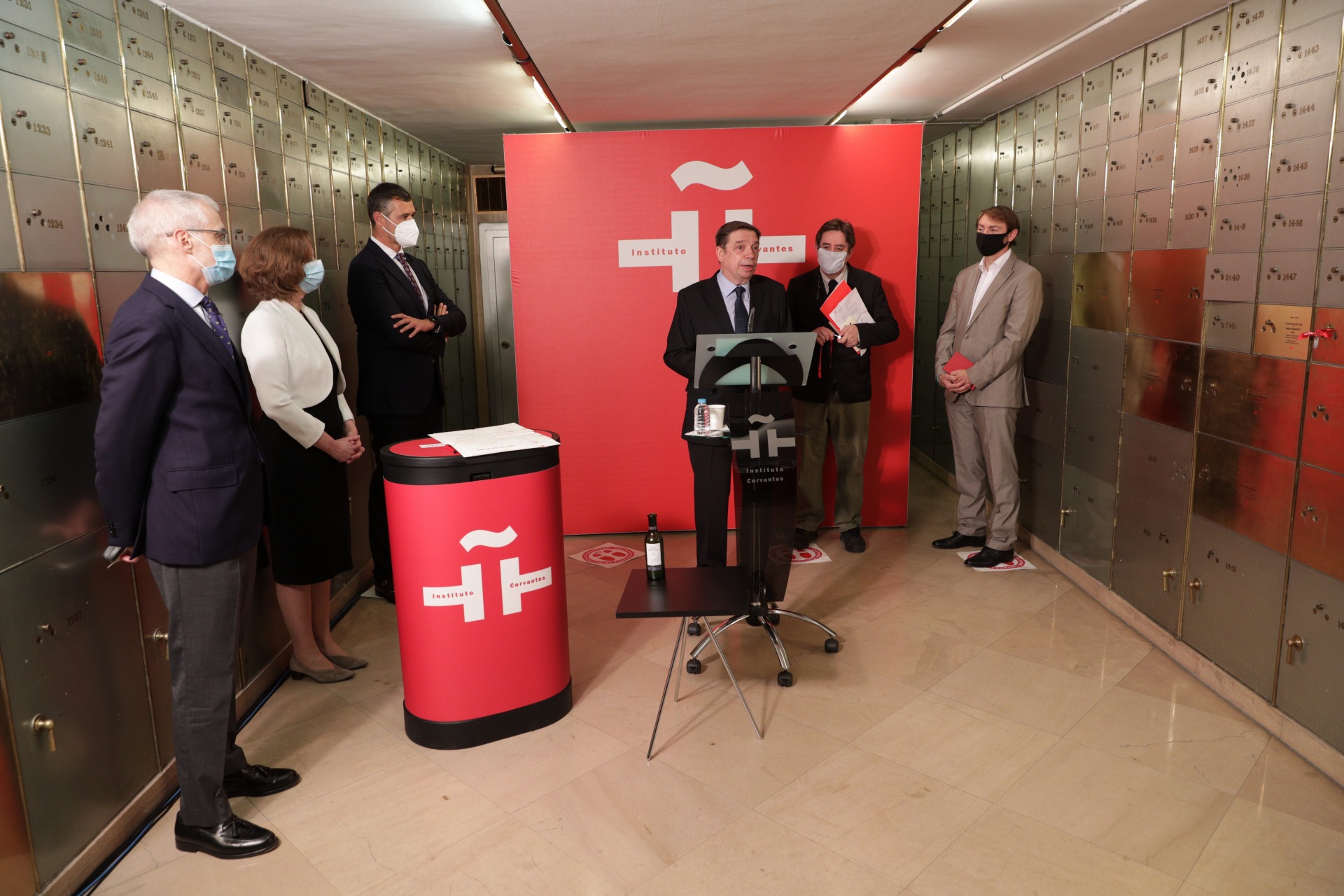 El ministro de Agricultura, Pesca y Alimentación, Luis Planas, ha participado hoy en la apertura de la Caja de las Letras, donde el Instituto Cervantes y la Federación Española del Vino (FEV) depositaron en junio de 2018 el manuscrito original del poema “Oda al Vino”, del escritor chileno Pablo Neruda. Coincidiendo con la renovación del convenio de colaboración entre ambas instituciones, se ha procedido a depositar un legado en homenaje al centenario del nacimiento de Mario Benedetti.