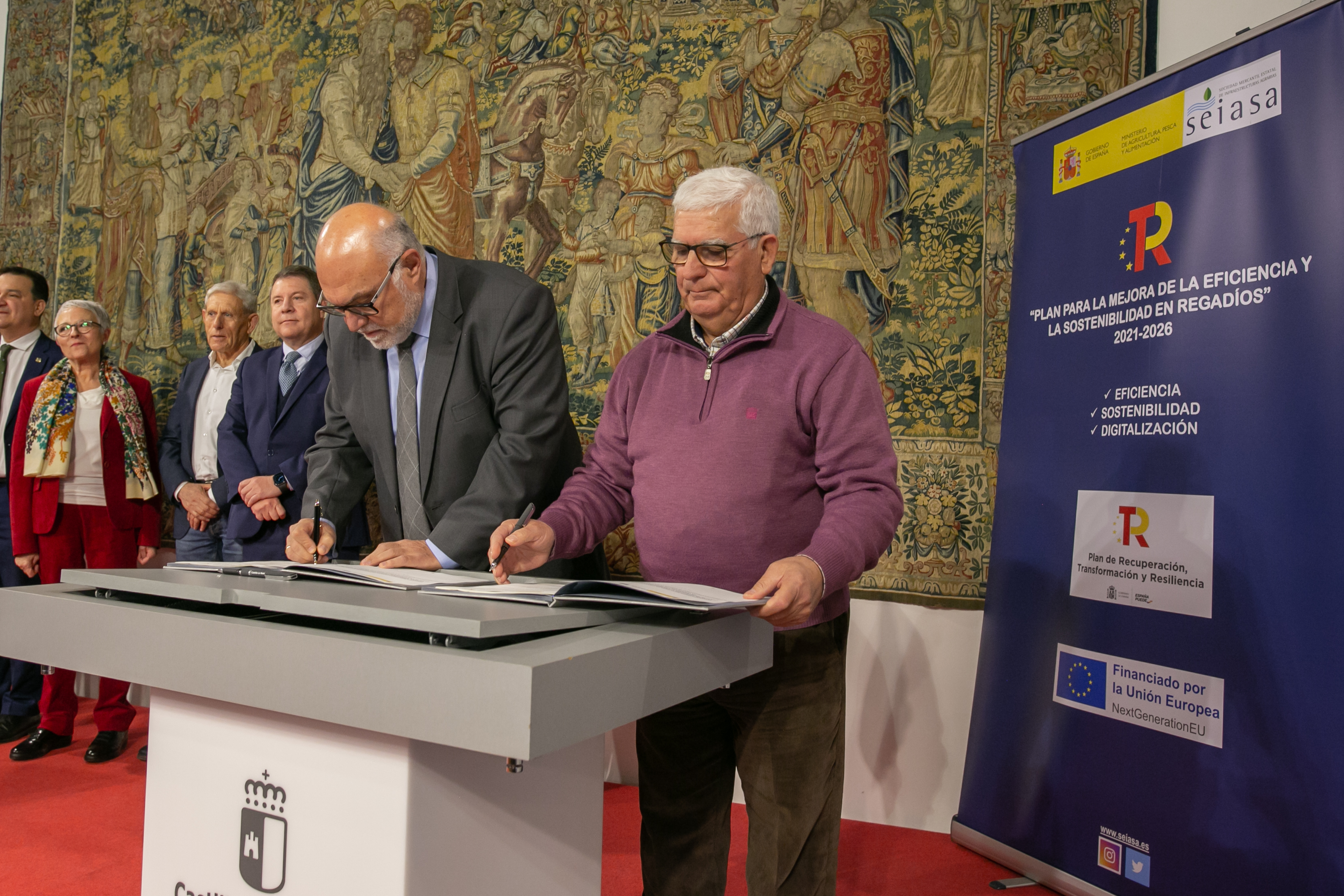 Para activar las primeras obras de la denominada Fase II, el presidente de la Sociedad Mercantil Estatal de Infraestructuras Agrarias (SEIASA), Francisco Rodríguez Mulero, entidad a través de la que se realizan las actuaciones, ha firmado hoy en Toledo tres convenios con las comunidades de regantes de Abenuj, Príncipe de España y Las Colleras, todas de la provincia de Albacete, con una inversión en conjunto de 13.346.732,24 euros (IVA no incluido). El acto ha sido presidido por el presidente de Castilla-La Mancha, Emiliano García-Page Sánchez y ha contado con la presencia de la directora general de Desarrollo Rural, Innovación y Formación Agroalimentaria, Isabel Bombal Díaz y del delegado del Gobierno en la comunidad autónoma, Francisco Tierraseca Galdón. Isabel Bombal ha destacado el importante esfuerzo que está realizando el Gobierno para apoyar la modernización de regadíos en España, a través del plan de recuperación, la PAC y otros fondos propios. Se trata de inversiones que contribuyen a fortalecer el tejido socioeconómico de las zonas rurales y cumplen con todos los requisitos de sostenibilidad ambiental que exige la Comisión Europea, ha asegurado. Con la firma de los tres convenios que hoy se ha realizado, se avanza en el apoyo a la modernización de regadíos en Castilla-La Mancha. Además de las actuaciones enmarcadas en el PRTR, Bombal ha señalado otras dos inversiones adicionales en consolidación de regadíos que va a ejecutar el ministerio con fondos propios por importe de 33 millones de euros. Los tres proyectos contemplan construir instalaciones fotovoltaicas de autoconsumo con placas de última generación y alto rendimiento, que permitirán a los regantes ahorrar costes energéticos y reducir las emisiones de CO2. En todos los casos las nuevas infraestructuras constarán de un sistema de automatización y telecontrol que mejorará la eficiencia de la instalación y su integración en los sistemas existentes. La segunda fase del plan para la mejora y eficiencia de la sostenibilidad en regadíos del PRTR, programa de modernización de regadíos dentro del PRTR contempla unas inversiones de 14.671.202 euros (IVA no incluido), que se suman a las dos ya firmadas en Castilla-La Mancha en el marco de la primera fase por importe de 23.722.800 euros (IVA no incluido). PLACAS FOTOVOLTAICAS FLOTANTES La comunidad de regantes Príncipe de España cuenta con la particularidad de que se instalarán también placas fotovoltaicas en una estructura flotante sobre las balsas existentes. Las actuaciones beneficiarán a 1.054 regantes que cultivan 5.053 hectáreas en los términos municipales de Tobarra, Aguas Nuevas y Fuente Álamo, en Albacete. Las obras del plan para la mejora y eficiencia de la sostenibilidad en regadíos del PRTR están financiadas con fondos Next Generation de la Unión Europea y su carácter público-privado supone que la aportación pública será de un máximo del 80% del coste de los gastos elegibles, mientras que las comunidades de regantes y usuarios objeto de la actuación aportarán el resto. Los proyectos incluidos en los convenios firmados hoy son los siguientes: