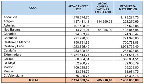 La Conferencia Sectorial de Agricultura y Desarrollo Rural, presidida por el ministro de Agricultura, Pesca y Alimentación con la asistencia telemática de los consejeros y consejeras del ramo, ha aprobado hoy la distribución entre las comunidades autónomas de 7,4 millones de euros para programas de erradicación de enfermedades de los animales. El reparto de estos fondos del Ministerio de Agricultura, Pesca y Alimentación fue autorizado por el Consejo de Ministros celebrado hace siete días. Esta línea de apoyo a las comunidades autónomas tiene como objetivo la ejecución de programas que permitan el control y posterior erradicación de determinadas enfermedades de los animales de importancia por sus implicaciones en la sanidad animal y por las consecuentes repercusiones que pueden tener tanto en la salud pública como en las exportaciones de los productos ganaderos españoles. La mayor parte de los fondos, 7.194.083,52 euros, irán destinados al programa nacional de control y erradicación de la tuberculosis bovina, para compensar la falta de cofinanciación comunitaria. El importe restante, 205.916,48 euros, se destina a Aragón y Baleares, para apoyar la adquisición de vacunas frente a los nuevos serotipos de lengua azul detectados durante el año 2024. CUADRO DE DISTRIBUCIÓN POR CCAA (EN EUROS) Además, la conferencia sectorial ha autorizado formalmente la segunda modificación del Plan Estratégico de la Política Agraria Común (PEPAC) para dar cumplimiento a los compromisos de los programas de desarrollo rural del anterior periodo. CONSEJOS CONSULTIVOS Luis Planas ha presidido también los Consejos Consultivos de Política Agraria y Pesquera para Asuntos Comunitarios, en los que ha informado a las consejeras y consejeros autonómicos sobre los asuntos a tratar en el Consejo de Ministros de Agricultura y Pesca de la UE de la próxima semana. Así, en el debate sobre la arquitectura ambiental de la nueva Política Agraria Común (PAC) introducido por la presidencia danesa, Planas ha expresado que España mantiene su posición y apoya firmemente que se mantenga como una herramienta indispensable para la seguridad alimentaria europea, sin perder de vista otros aspectos como la lucha contra el cambio climático, la protección de los recursos naturales o el relevo generacional. En esta línea, Planas ha defendido la pervivencia de la actual estructura de pagos y de una dotación económica suficiente de la PAC. Ha señalado la vuelta a la normalidad de los mercados agroalimentarios en Europa tras varios años de sequía y las medidas adoptadas en materia de aceite de oliva y vino. Al Consejo, que se celebrará en Luxemburgo, asistirá como invitado el ministro de Agricultura de Ucrania, Mikola Soslki. Respecto al aceite de oliva, Planas trasladará un mensaje de tranquilidad para la nueva campaña, que contará con un mercado más equilibrado, tras conocerse la primera estimación de la cosecha. También expondrá la situación del mercado del vino, que alcanzó en 2024/2025 una producción de 31,1 millones de hectolitros, un +9% más que la anterior, debido a las condiciones climáticas favorables, si bien la cifra está por debajo de la media de las cinco últimas. Aun así, persisten desajustes entre regiones y tipos de vino, con dificultades específicas en determinadas zonas productoras. Por ello, España considera prioritario adoptar cuanto antes el paquete de medidas para el sector vitivinícola, para reforzar su estabilidad en un contexto en el que los precios se mantienen estables, pero con tensiones estructurales en la demanda, especialmente por los cambios en los patrones de consumo. En materia de pesca, el Consejo de Ministros abordará las posibilidades de pesca en el mar Báltico, en el que España no tiene interés directo, pero cuyo debate será relevante para seguir las propuestas sobre cuotas en el conjunto de las pesquerías de cara a la próxima negociación pesquera de diciembre. España mantendrá su defensa de que se tengan en cuenta en todas las decisiones los componentes sociales, económicos y de empleo, además de los medioambientales. Los ministros también intercambiarán sus puntos de vista sobre la reunión anual de la Comisión Internacional para la Conservación del Atún Atlántico, que se celebrará en Sevilla entre el 17 y el 24 de noviembre y en la que el comité científico propondrá para el siguiente periodo trianual un incremento del 20 % del actual TAC de atún rojo para el Atlántico este y el Mediterráneo, hasta alcanzar 48.000 toneladas.