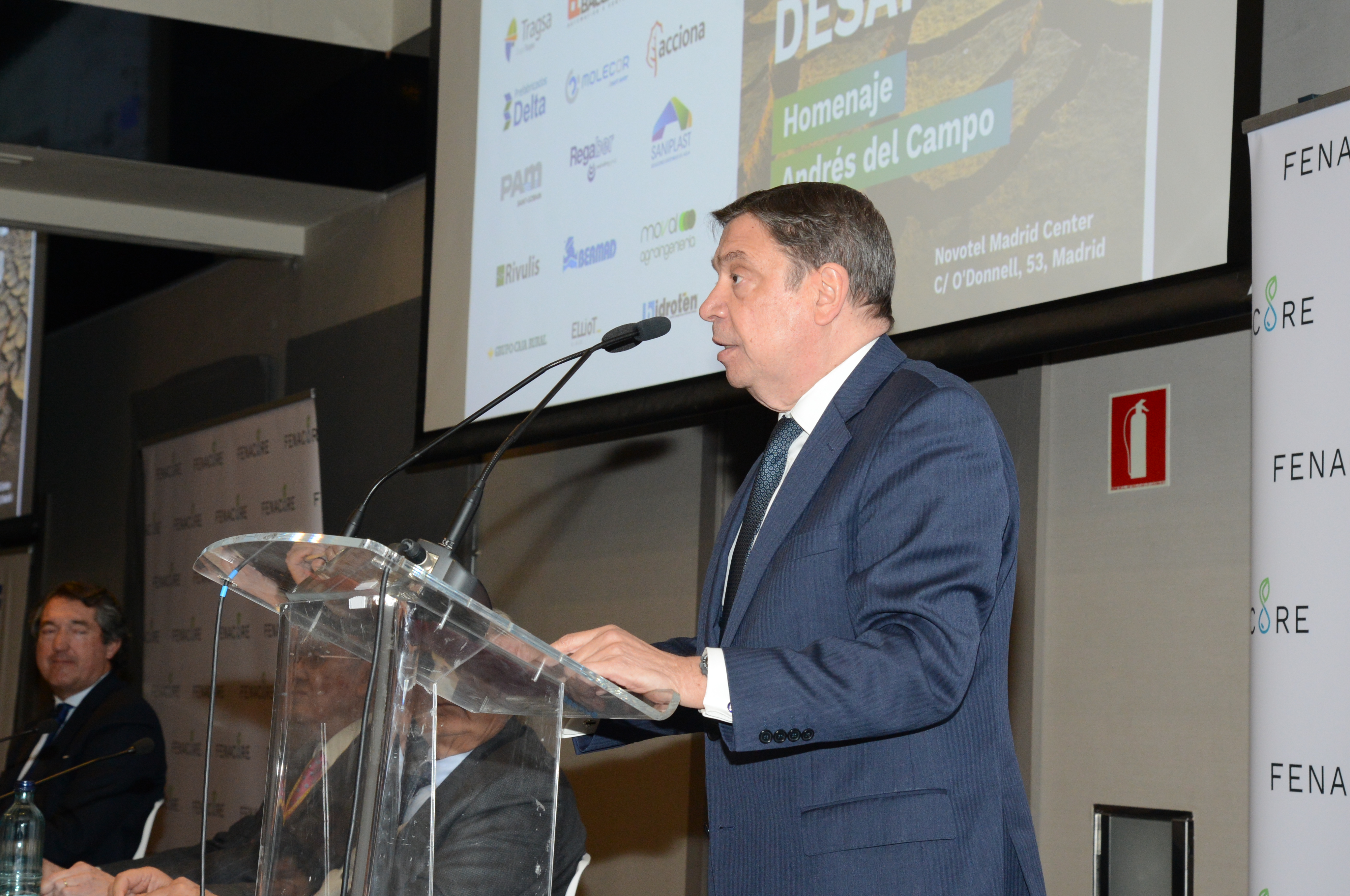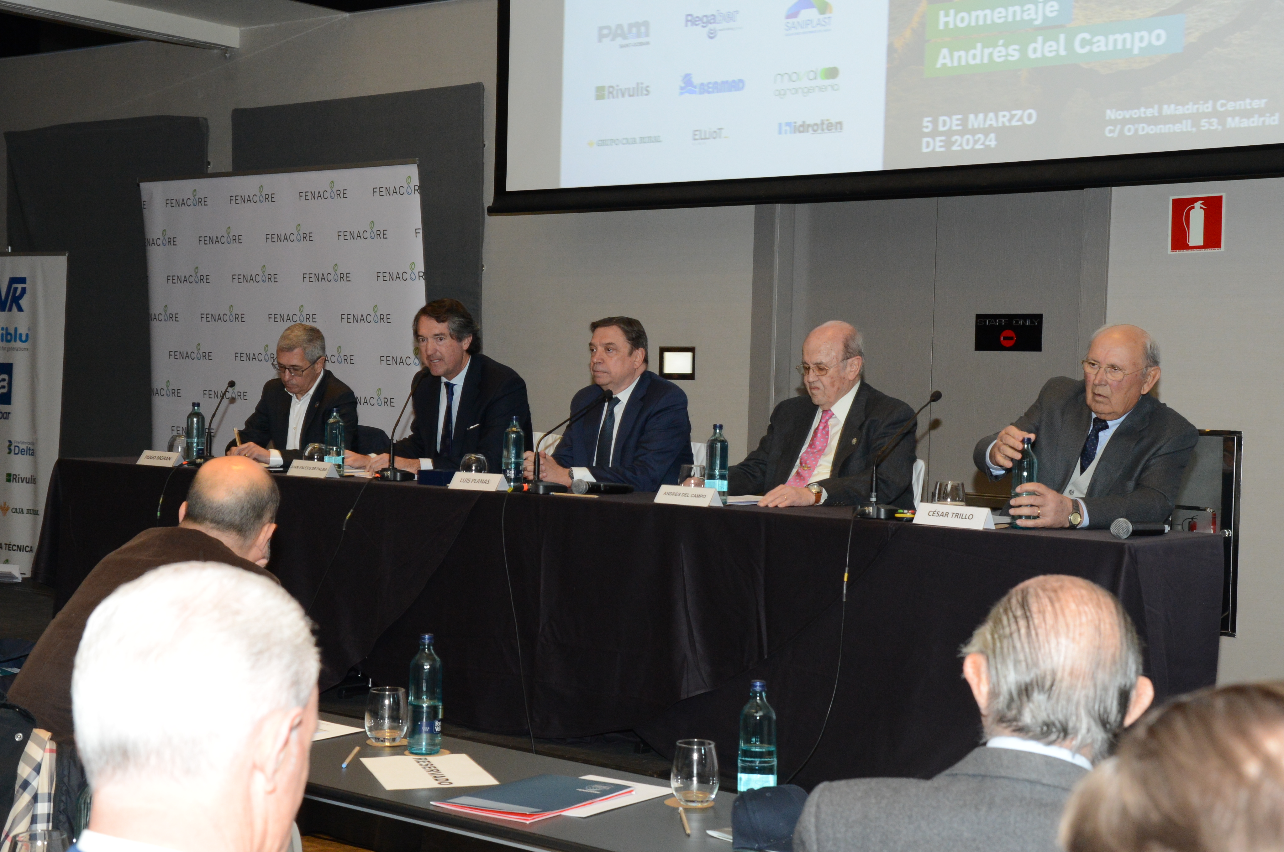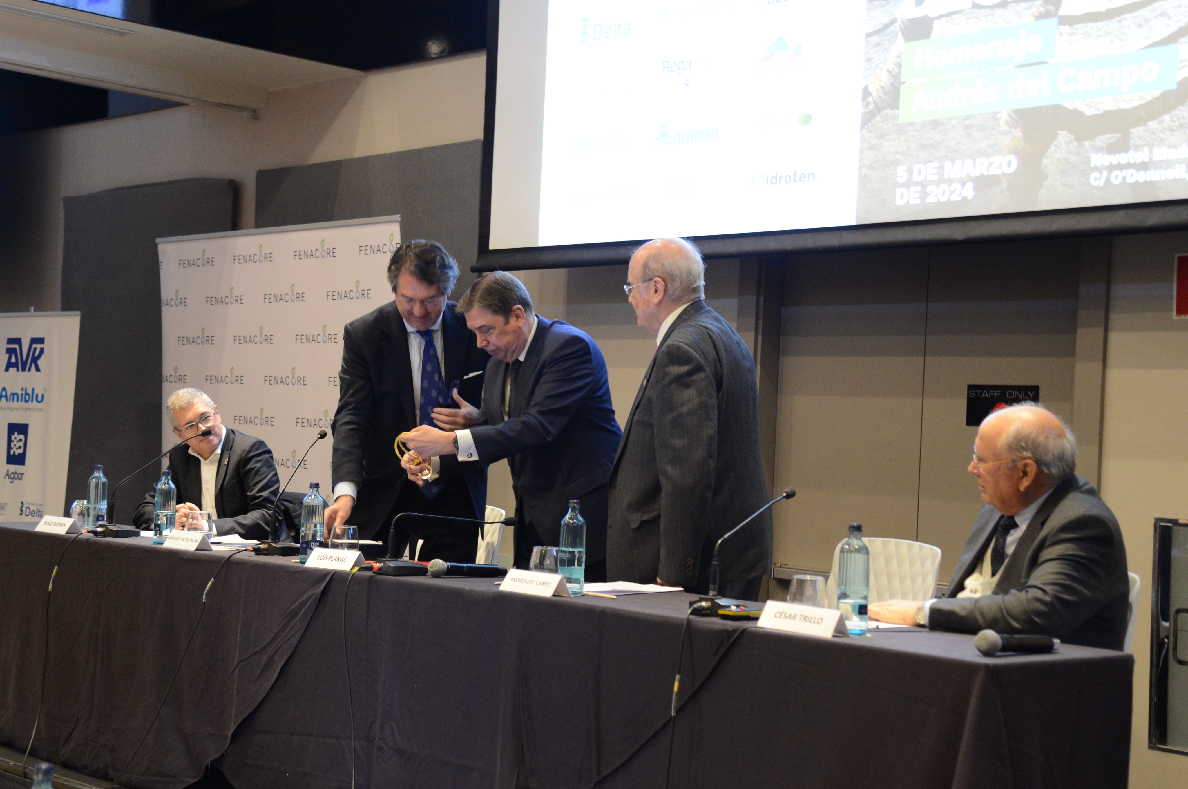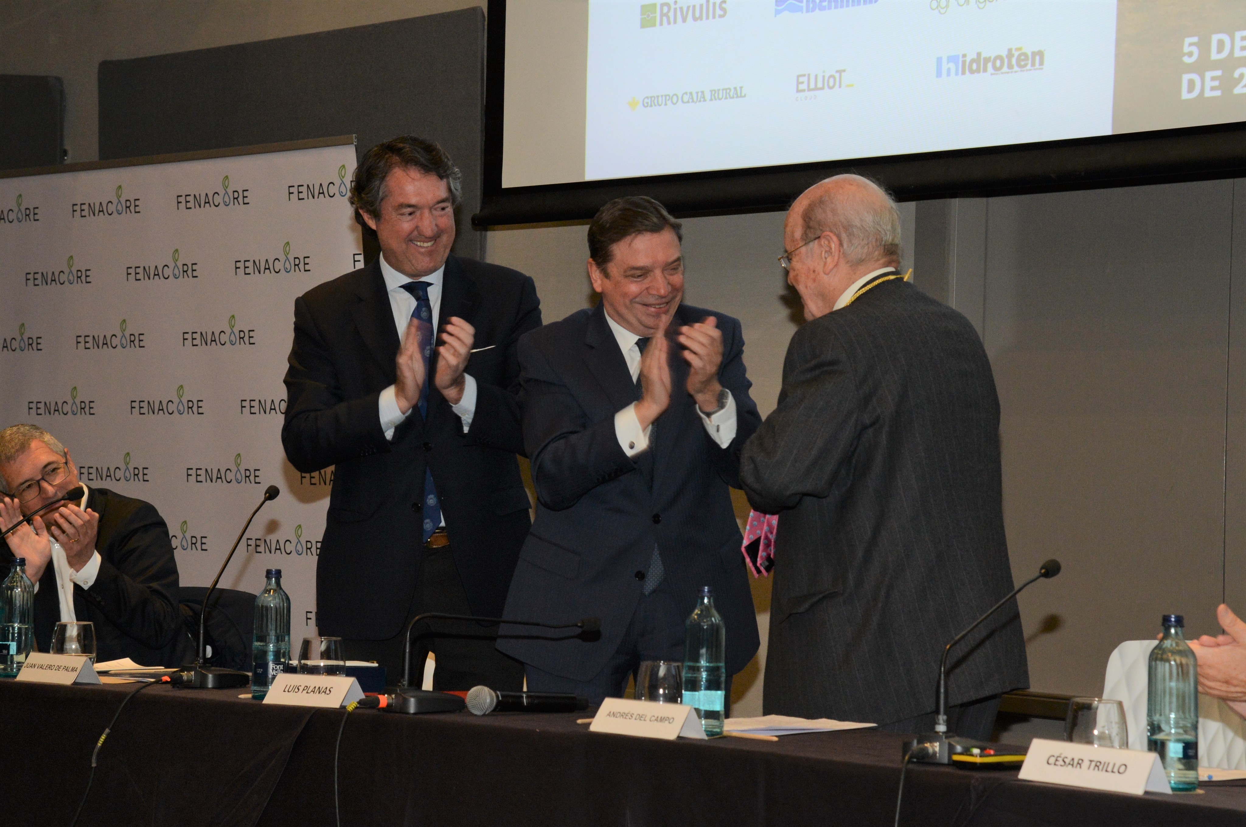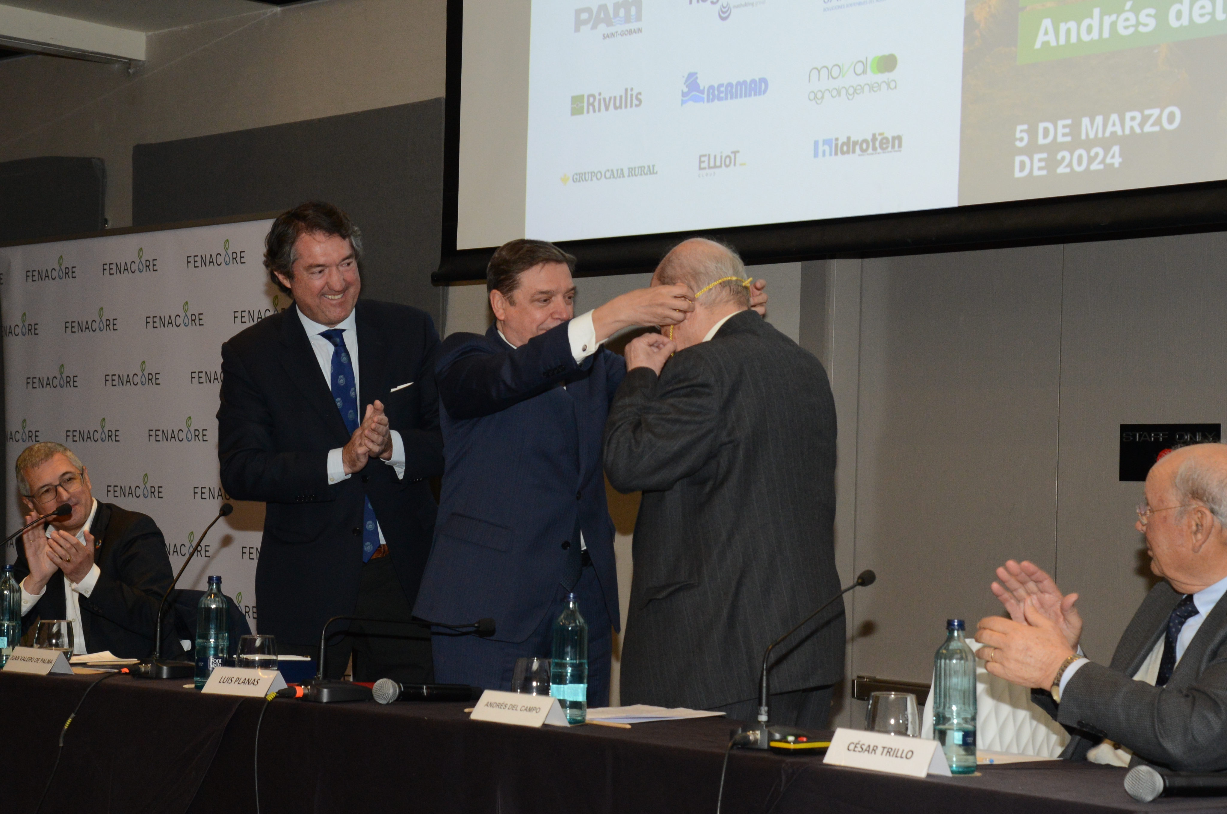 Durante la jornada, el ministro ha entregado a Andrés del Campo, presidente de honor de Fenacore, una condecoración en reconocimiento a sus casi 30 años de trabajo al frente de este organismo. Planas ha felicitado a Andrés del Campo por su defensa de los intereses de las comunidades de regantes y por su esfuerzo a favor de los regadíos sostenibles y eficientes. Asimismo, ha reconocido su gran capacidad de diálogo y de trabajo para hacer frente a los retos del sector.