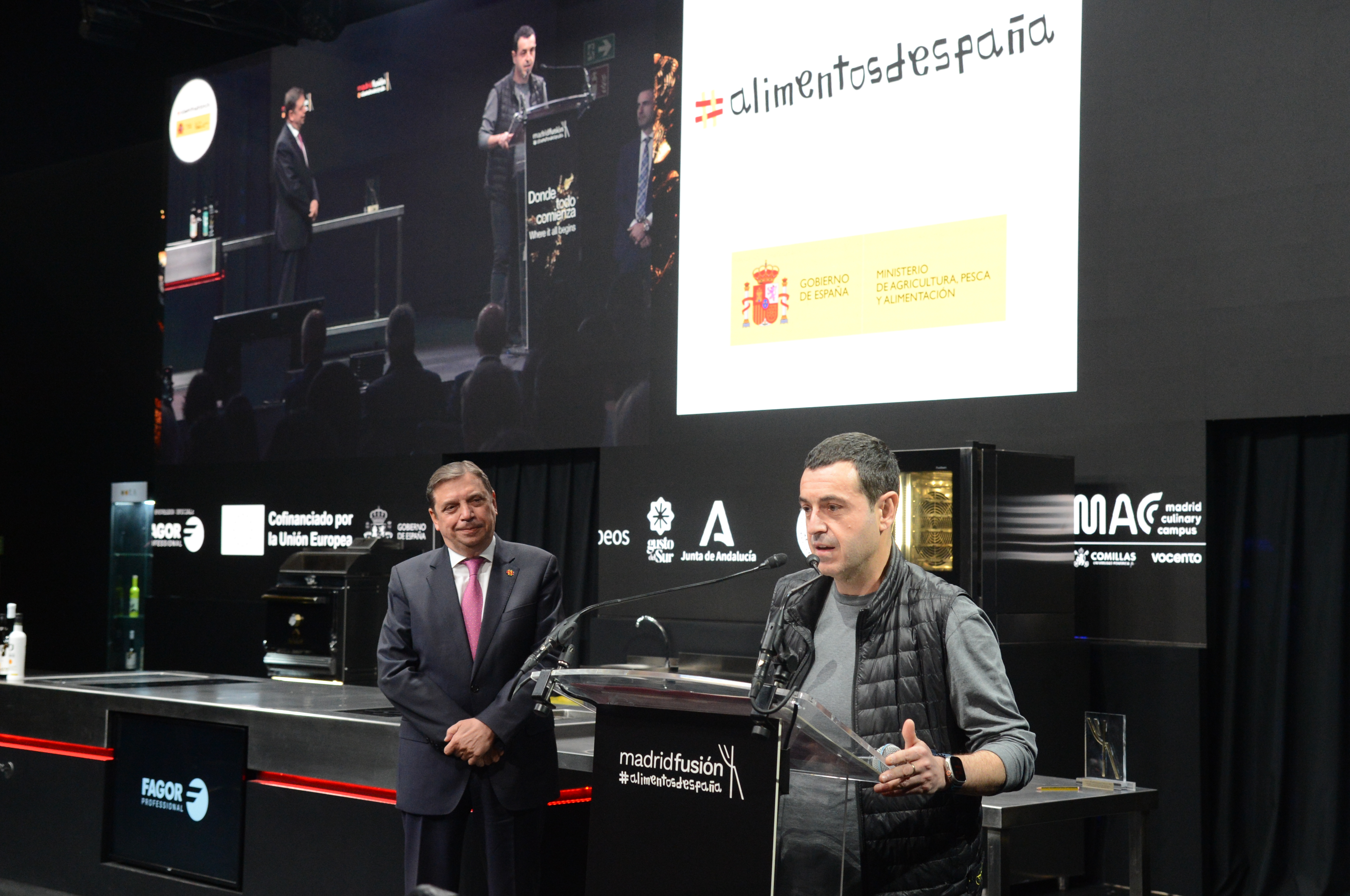 Luis Planas ha hecho entrega del Premio “Defensa del Producto Alimentos de España” al cocinero Ricard Camarena, en reconocimiento a su labor pionera en materia de lucha contra el desperdicio alimentario, “aprovechando los productos de una forma integral, aunque tengan una apariencia fea o no estén lo suficientemente valorados”. El ministro ha subrayado el enorme potencial que tiene el trinomio entre gastronomía, sector agroalimentario y turismo en España. Planas ha entregado este premio en el Congreso Internacional de Alta Cocina Madrid Fusión Alimentos de España, sobre cuyo lema, “Donde todo comienza”, ha comentado que recuerda al punto de partida de la excelencia culinaria, así como el origen de los productos alimentarios y las personas que lo hacen posible, que cultivan los campos, crían ganado u obtienen el pescado y marisco que llegan luego a las mesas de los hogares y restaurantes. Durante el acto de entrega de premios también se han puesto de manifiesto las tres grandes estrategias de alimentación que el ministerio pretende focalizar: la Estrategia Nacional de Alimentación, la prevención del desperdicio alimentario y la de Alimentos de España. La primera estrategia consistirá en una reflexión sobre el futuro de la alimentación, abordando cuestiones como la seguridad alimentaria, el etiquetado de alimentos o la accesibilidad a productos sanos y sostenibles. Una reflexión necesaria para poder crear “un mapa de ruta para la autonomía de alimentación de nuestros ciudadanos ante un mundo cambiante con conflictos geopolíticos crecientes que dificultan la obtención de materias primas y alimentos”. La estrategia de prevención de pérdidas y del desperdicio alimentario tiene como clave el proyecto de Ley que aprobó el Consejo de Ministros el pasado día 9 y que ahora debe ser tramitado en Cortes. Planas ha explicado que el Ministerio de Agricultura, Pesca y Alimentación cuenta desde hace años con estadísticas para cuantificar el desperdicio de alimentos y la tarea actual consiste en una mayor campaña de sensibilización a través de acciones divulgativas o campañas como “Aquí no se tira nada” y “El país más rico del mundo”. Por último, la Estrategia Alimentos de España está diseñada para destacar la potencia alimentaria del país. Luis Planas ha explicado que este era uno de los grandes objetivos de la legislatura, ya que ser “la huerta de Europa” y convertirse en uno de los principales proveedores de productos frescos y saludables es “un concepto lleno de valor, significado y orgullo”. Ha destacado que durante los últimos años el ministerio ha realizado una importante inversión en esta estrategia y se ha conquistado el territorio de la gastronomía y se pretende que en el futuro se exploren nuevos territorios como la cultura, el turismo y el deporte.