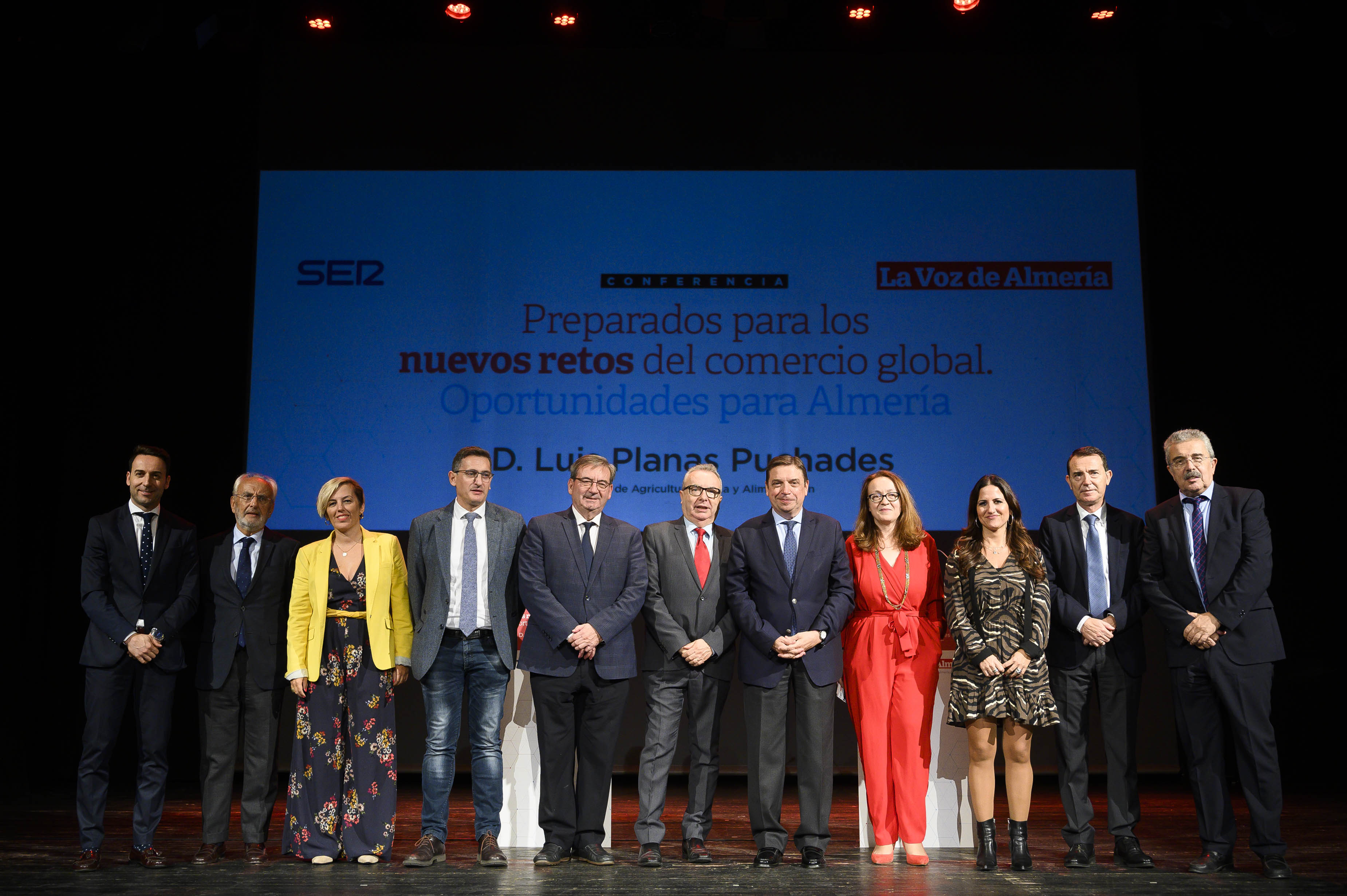 El ministro de Agricultura, Pesca y Alimentación en funciones, Luis Planas, ha intervenido hoy en una conferencia informativa, organizada por el periódico La Voz de Almería, sobre los nuevos retos del comercio global, un asunto que el ministro ve crucial para el sector agroalimentario español. De cara al futuro, ha añadido, hay que exportar más y a más destinos, y de mejor forma que los demás.