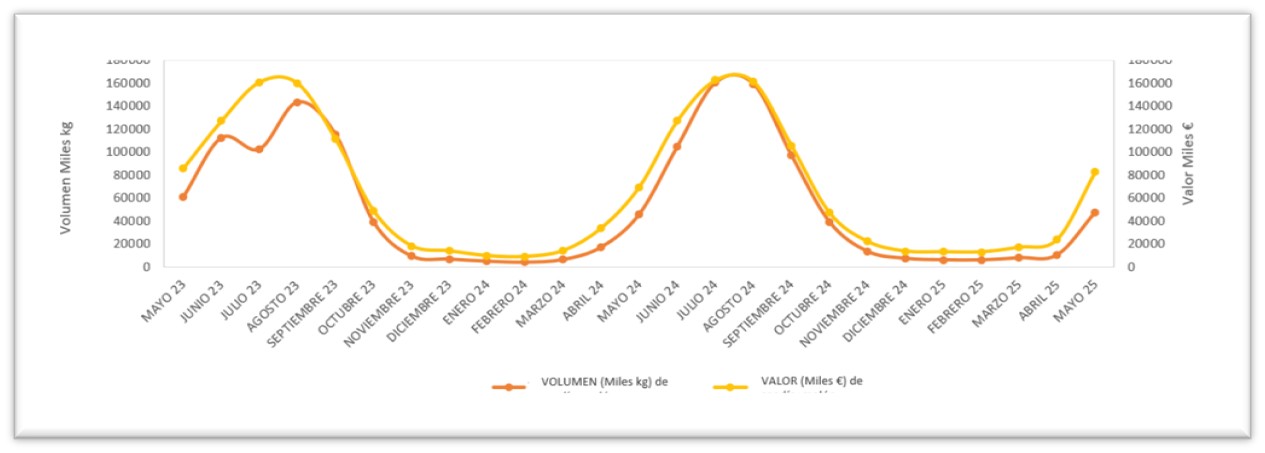 Volumen (miles de kg) y valor (miles de €) de melón y sandía. Datos de mayo de 2023 a mayo de 2025
