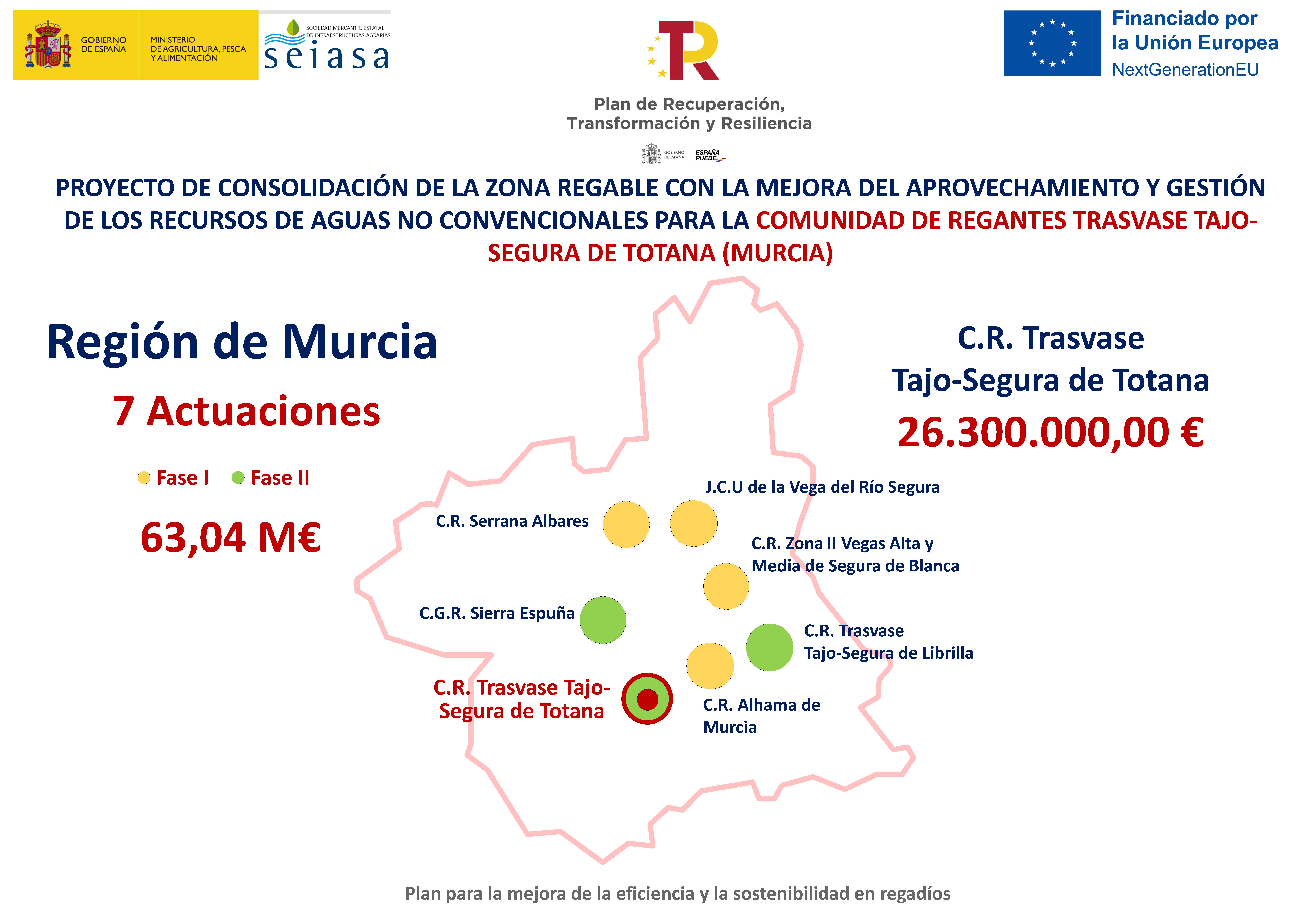 El Ministerio de Agricultura, Pesca y Alimentación (MAPA) ha firmado hoy en Murcia un convenio de colaboración con la comunidad de regantes Trasvase Tajo-Segura de Totana para invertir 26.300.000 euros (IVA no incluido) del Plan de Recuperación, Transformación y Resiliencia (PRTR), en nuevas infraestructuras que permitan regar con aguas no convencionales esta zona de la huerta murciana.