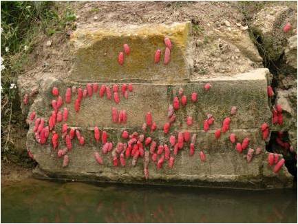 • Movimiento activo de los caracoles aguas arriba (reptación) o a través de corrientes de agua de las acequias y canales (dispersión pasiva por flotación).