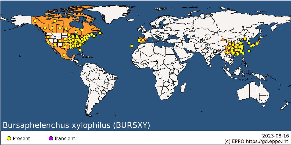 En Europa se detectó en Portugal en 1999. Actualmente sigue presente en Portugal, donde la estrategia es de contención, y en España, con estrategia de erradicación en las regiones en las que se ha detectado.