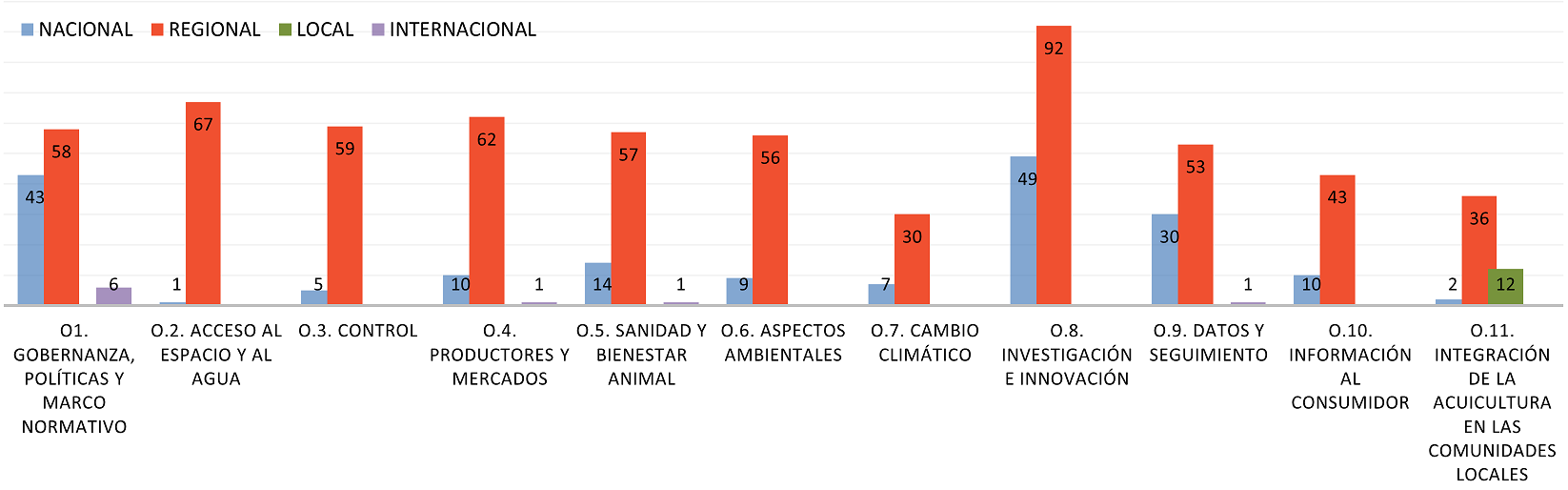 Las autoridades regionales han previsto trabajos en todas las áreas, mientras que los trabajos a escala nacional se concentran especialmente en Gobernanza (O1), Investigación e Innovación (O8) y Datos y Seguimiento (O9).