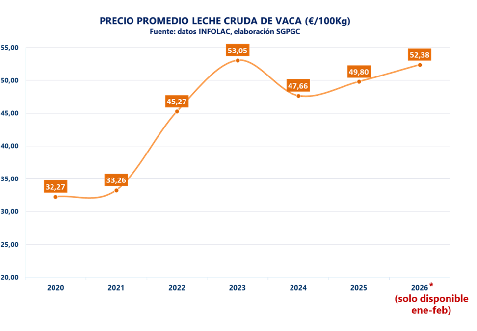 Por otro lado, los precios percibidos por los ganaderos han mostrado un comportamiento favorable a lo largo de 2025 y en el inicio de 2026, situándose incluso por encima de la media de la Unión Europea, en el entorno de los 0,53 euros el litro de leche pagado a los ganaderos frente a una media de 0,44 euros/litro de la UE (enero de 2026). El precio en España se sitúa en un 16 % por encima de la media de la UE. Entre los factores que explican esta situación se encuentran el aumento de la producción en otros Estados miembros y la aplicación en España de instrumentos como el paquete lácteo y la ley de la cadena alimentaria.