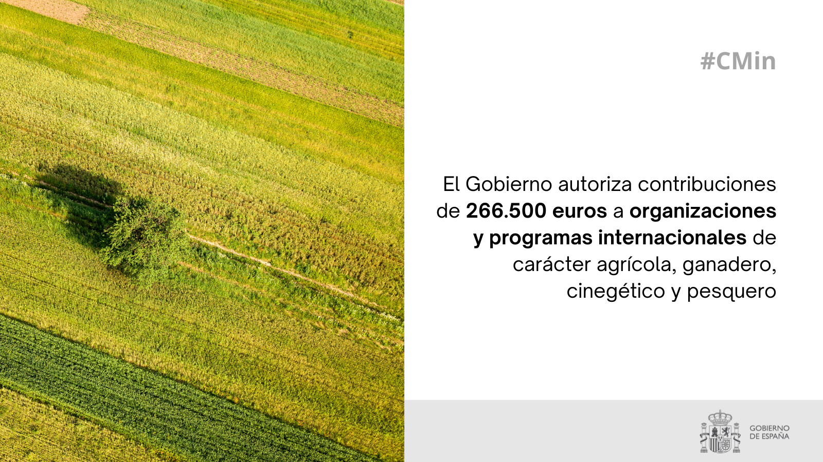 El Consejo de Ministros ha autorizado hoy al Ministerio de Agricultura, Pesca y Alimentación a realizar seis contribuciones por un valor total de 266.501,46 euros a distintos organismos y programas internacionales de carácter agrícola, ganadero, cinegético y pesquero, que se consideran de interés para España.