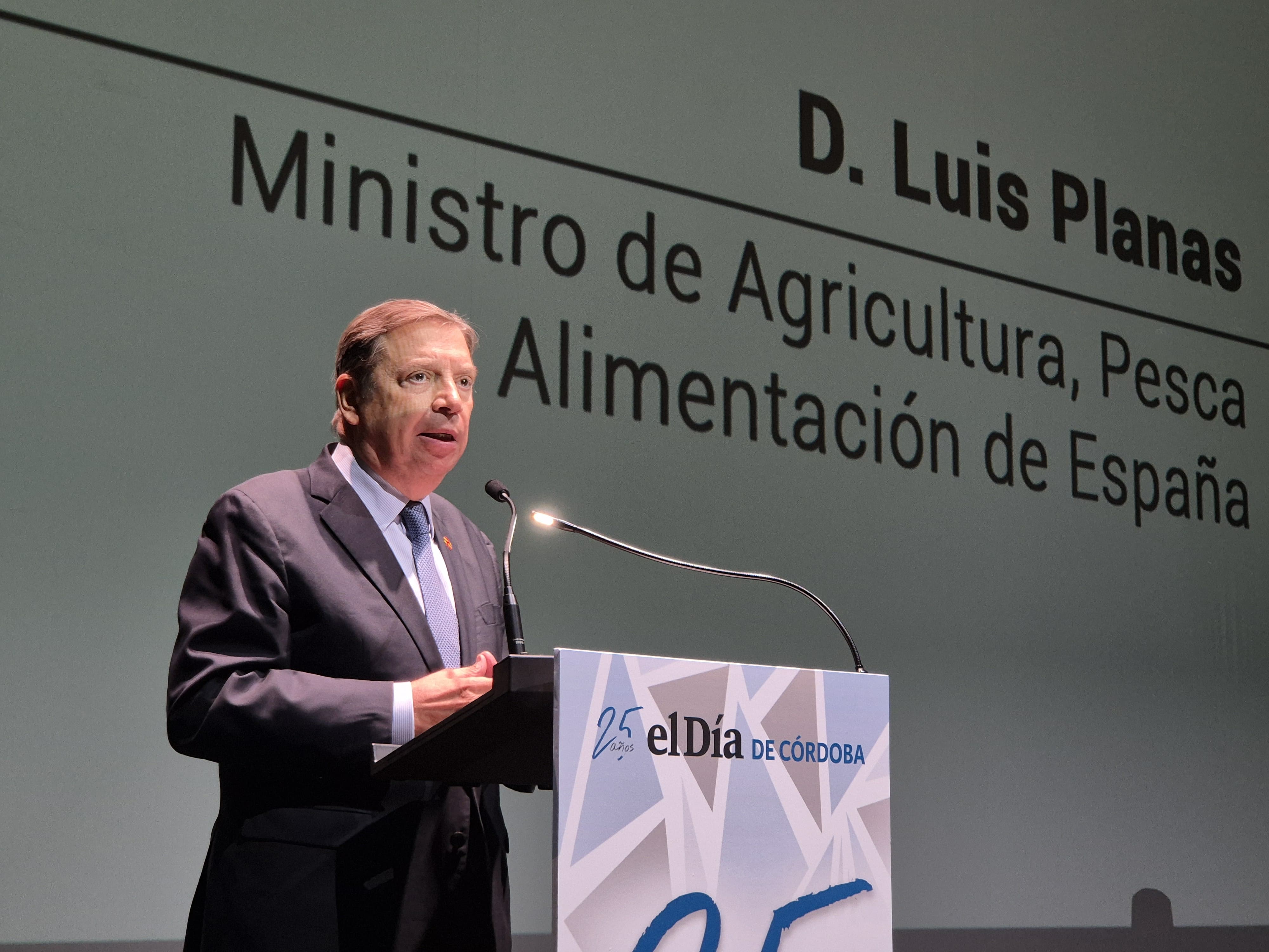 El ministro de Agricultura, Pesca y Alimentación, Luis Planas, ha intervenido hoy en el acto de celebración del 25º aniversario de El Día de Córdoba, del Grupo Joly, que se ha celebrado en la Caja Negra del Centro de Creación Contemporánea de Andalucía.