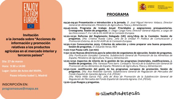 La jornada contará con la participación de la Subdirección General de Promoción de los Alimentos de España, expertos del Fondo Español de Garantía Agraria (FEGA), La Comisión Europea y la Agencia Ejecutiva Europea de Investigación (REA).