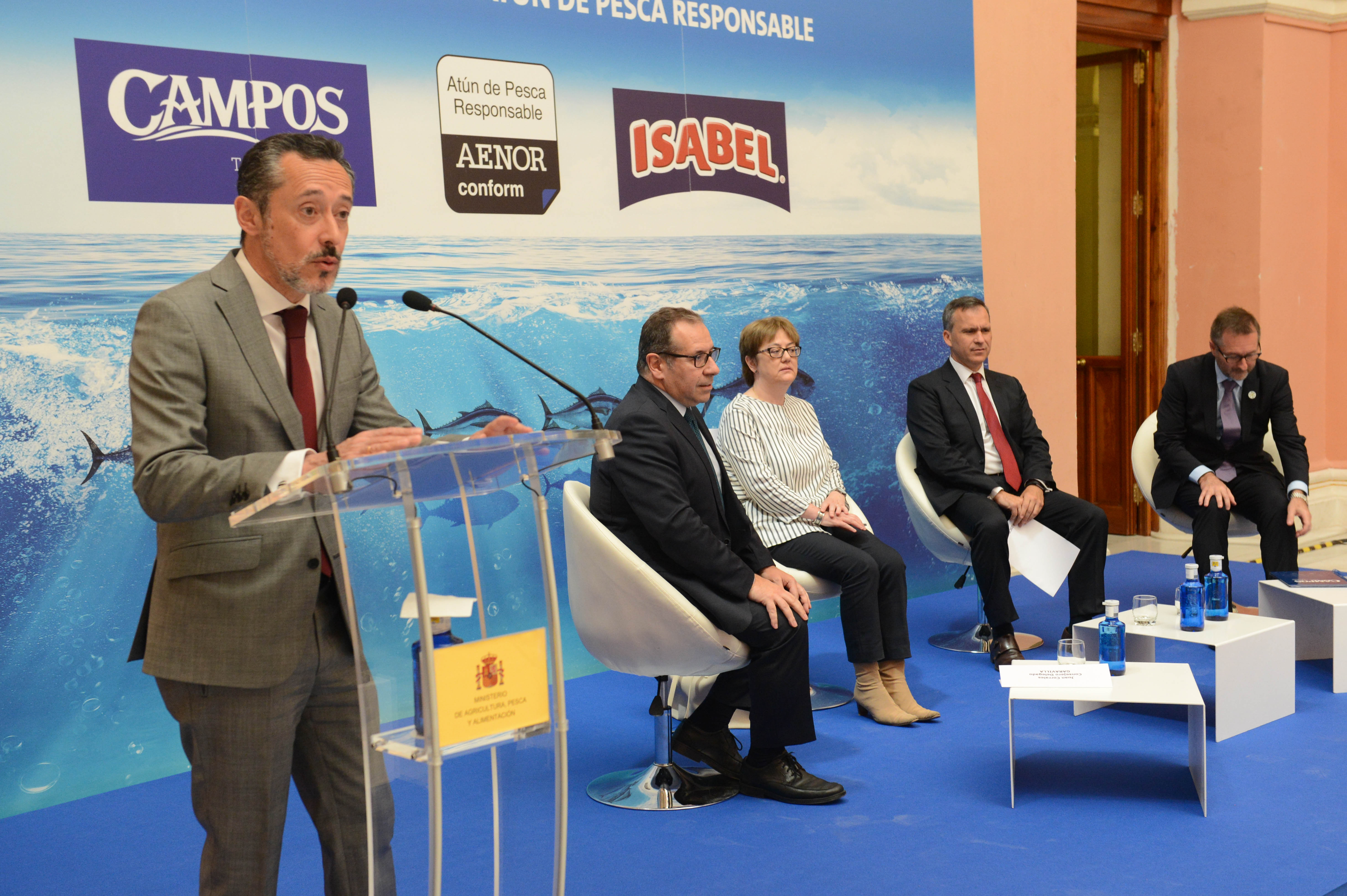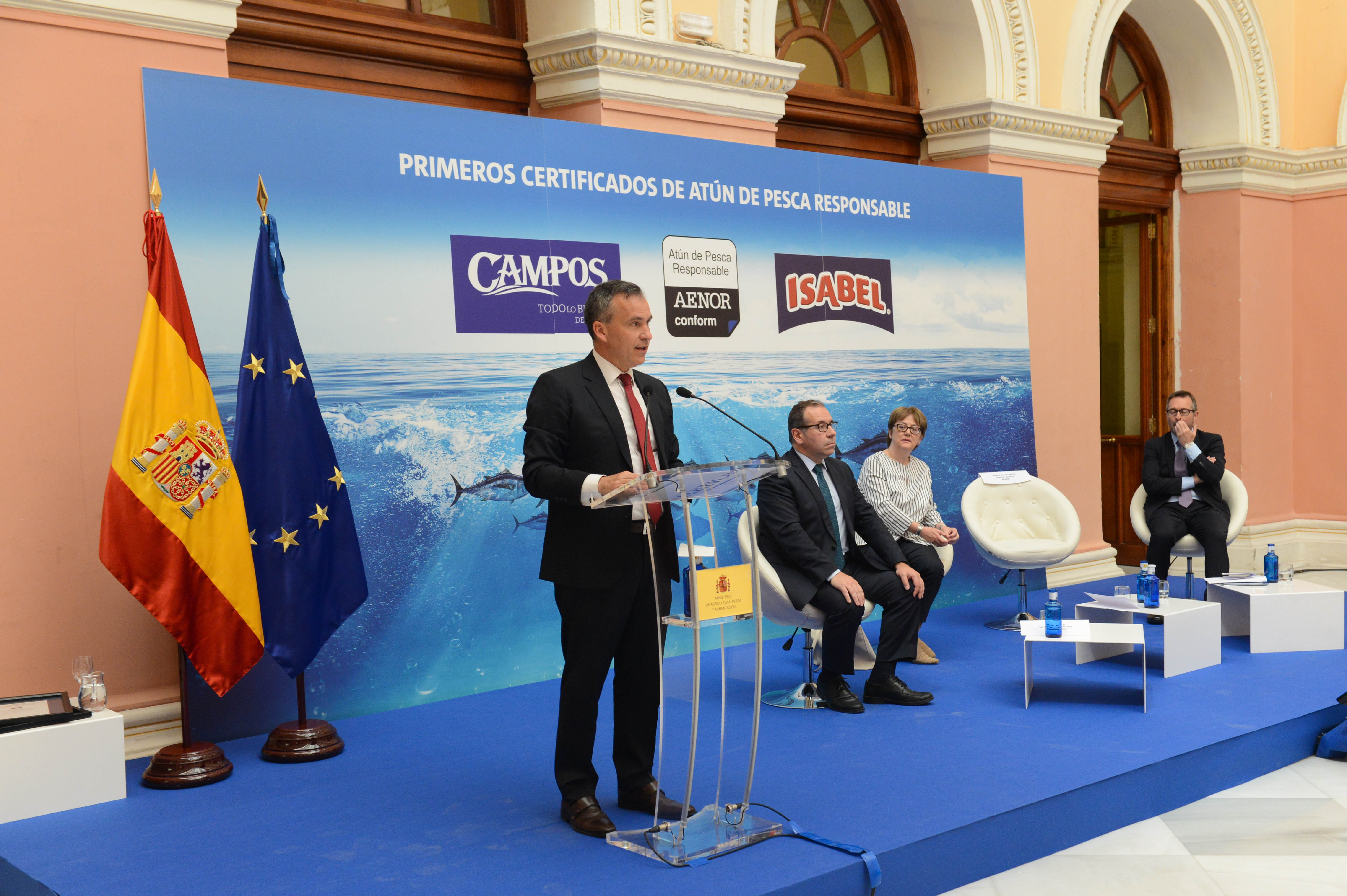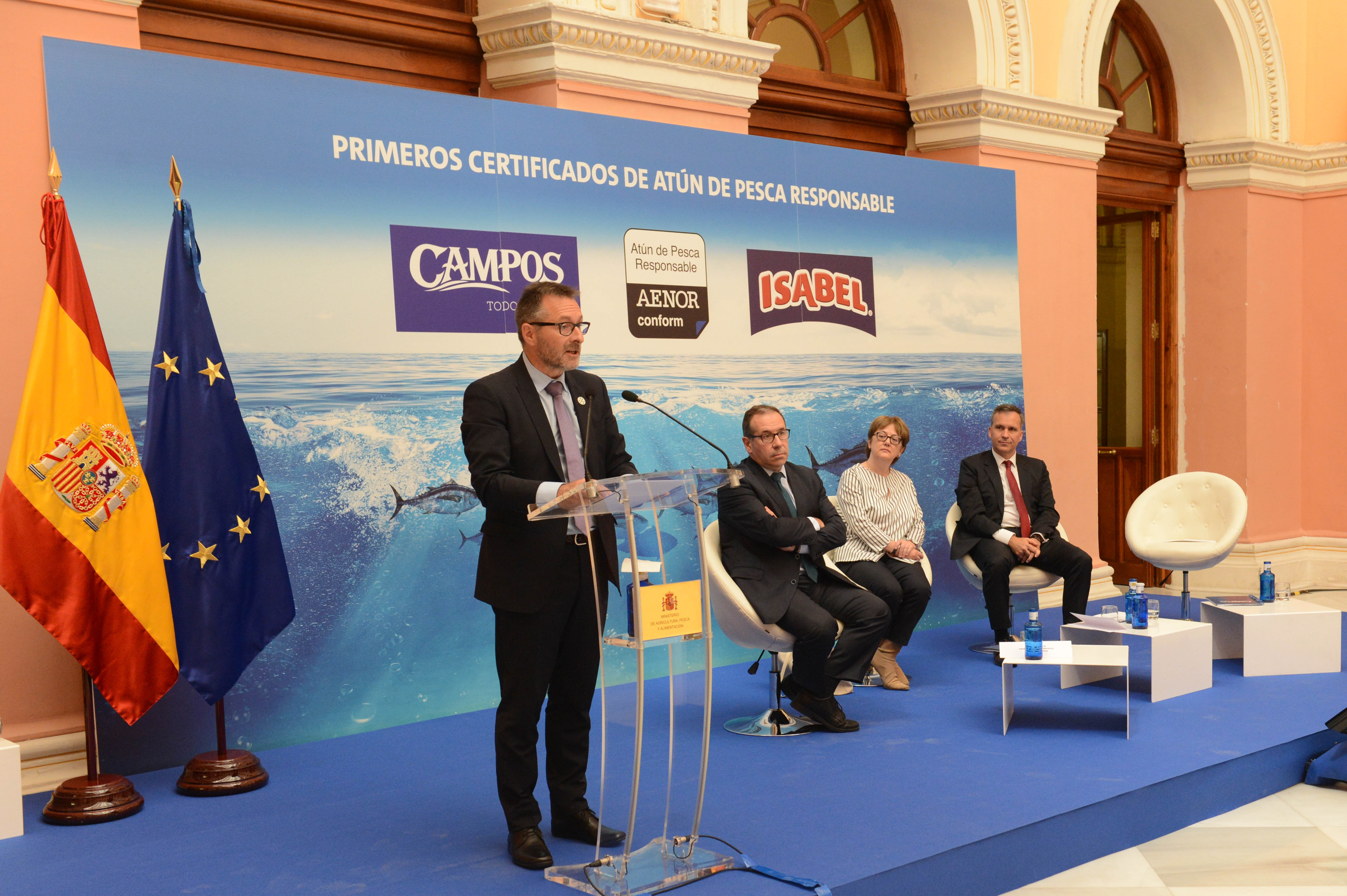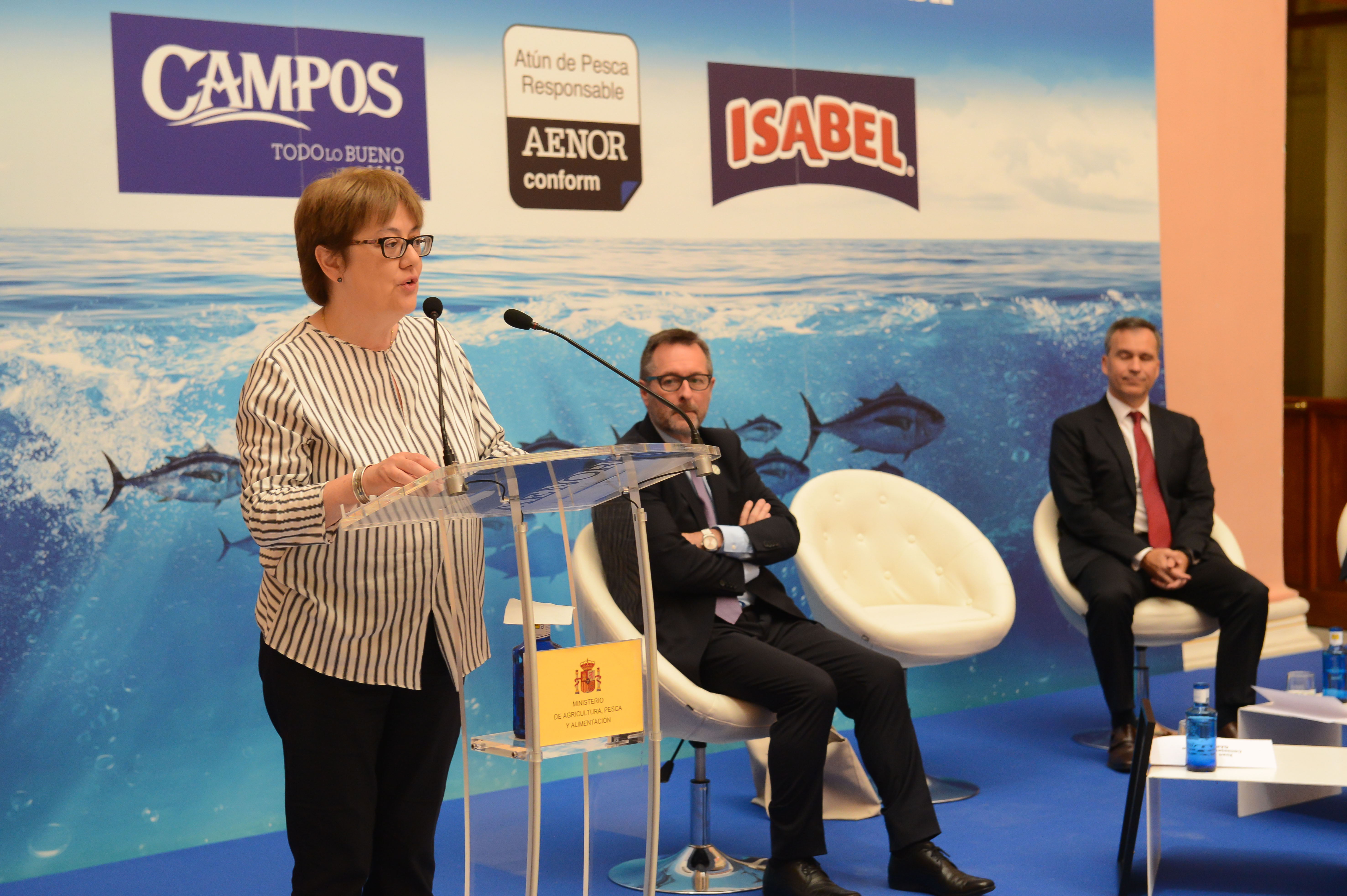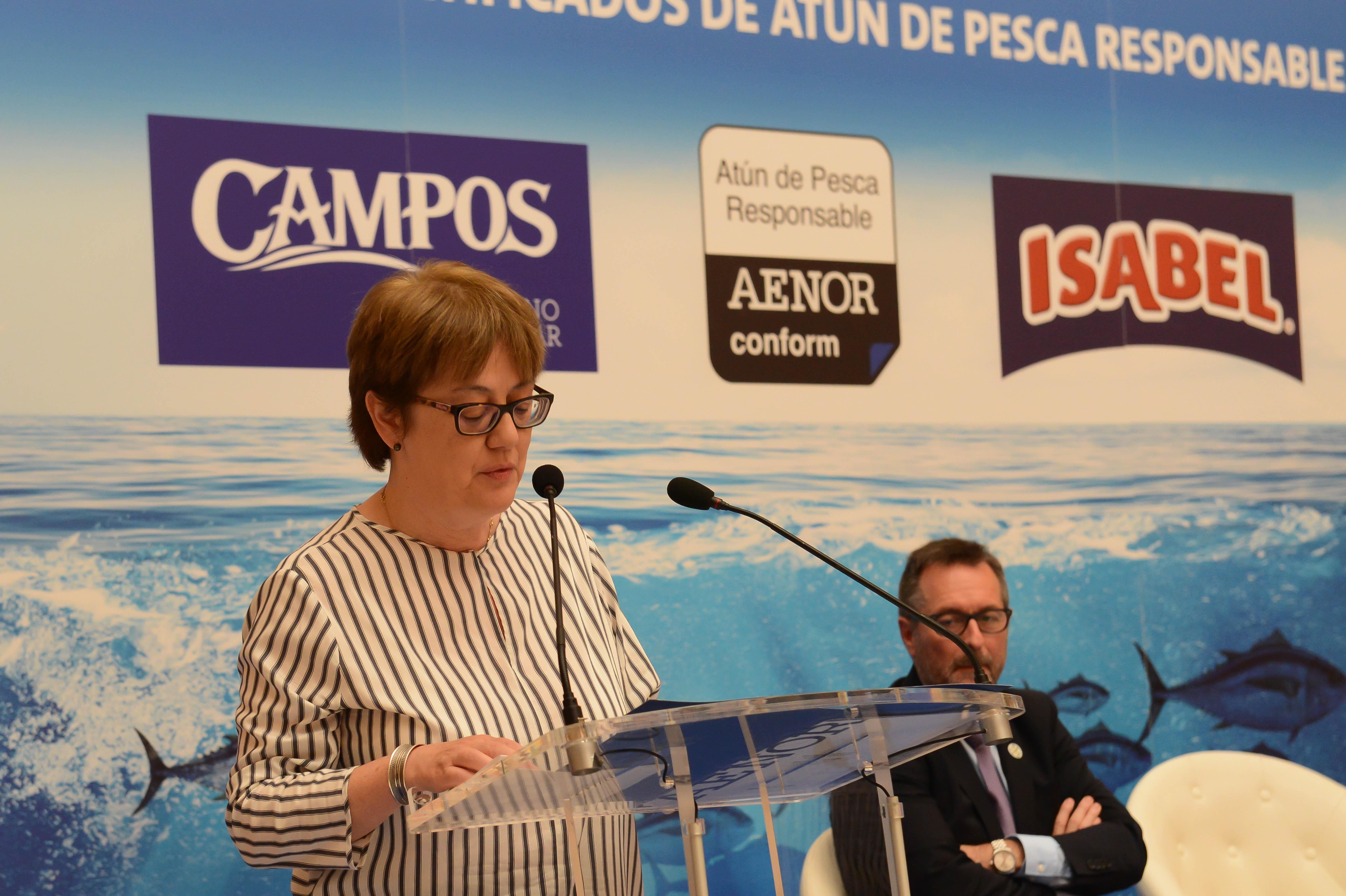 La secretaria general de Pesca, Alicia Villauriz, ha participado hoy en la entrega de las primeras certificaciones de la Cadena de Custodia APR de AENOR a las marcas conserveras “Isabel” y “Campos”, que les permitirá poner el logo AENOR CONFORM “Atún de pesca responsable”.