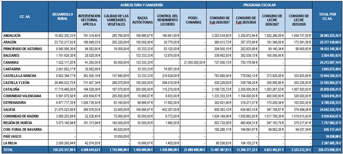 Además, se realiza también una reasignación de fondos correspondientes al curso actual, 2025/2026, por montantes totales de 13,2 millones de euros para el programa de frutas y hortalizas y 5,3 millones de euros para el de leche.